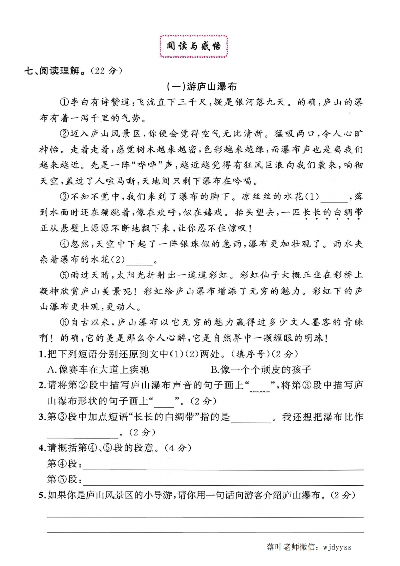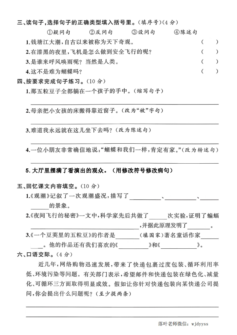 2025人教版四年级语文上册第一次月考卷(检测范围:第一、二单元)时间:90分钟满分:100分题序三四五六七八总分得分积累运用弥一、读句子,看拼音,写词语。(8分)1.姐姐牵着我的手,去看田野里成熟的黄澄澄的zhuang jia(),看果封靠园中一串串紫色的pútao(),看溪水在灰白色的éuǎn()石间欢快地tiàoyue()。线2.互联网将céng jing()隔着千山万水的人们联结在了一起。人们可以在网上tdntǎo()人生zhéi(),这真是一件令人内yu kuai()的事情。二、选择题。(12分)量不1.下列加点字注音有误的一项是()。(3分)A.媒体(mei)豌豆(wn)B.船舶(bó)荧屏(ying)C.霸占(bà)青苔(t6i)D.窗框(kuàng)揭开(jiē)要2.“身子单薄的他因发现了两者之间的联系而欢呼雀跃”。下列选项中的加点字与句中加点字的读音都相同的一项是()。(3分)答A.薄片系扣子鸟雀B.薄弱系列家雀儿毁C.薄脆系鞋带雀鹰D.薄利关系麻雀题3.下列词语与表示声音的画面无关的一项是()。(3分)A.低声细语B.悄无声息C.威风凛凛D.声如洪钟4.下面说法不正确的一项是()。(3分):A.边读文章边想象描绘的画面,可以加深对文章内容的理解。B.读文章时我们可以从多个角度去思考提问。C.小红通过网络查阅自己不懂的问题,这是不对的。D,环境和我们的生活密切相关,我们要保护环境。落叶老师微信:wjdyyss