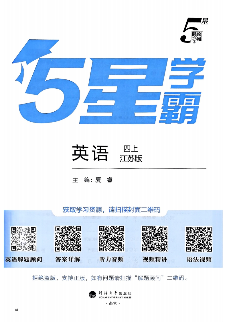 2025四年级英语上册《5星学霸》译林版tangqi882天前发布关注私信82.63MB178页0325 第1页 / 共178页 第2页 / 共178页 第3页 / 共178页 试读已结束,还剩175页,您可下载完整版后进行离线阅读 2025四年级英语上册《5星学霸》译林版此内容为付费资源,请付费后查看¥9.9¥19.9VIP会员免费立即购买您当前未登录!建议登陆后购买,可保存购买订单付费资源© 版权声明本站是一个信息分享及获取的平台,不确保部分用户上传资料的来源及知识产权归属,资料由老师投稿,公开渠道整理,网友上传,如果侵犯到您的权益,请联系客服删除THE END教师资料 文本预览 星主编:夏睿○根据新教材编写)精练课内知识聚焦专顶能力拓展课外积累渗透初高理念引颛学习趋势树立文化自信英语四上含14个语法精讲视频江苏版16个方法精讲视频▣52视频精讲内容升级扫码解锁讲题型方法√讲思维模型讲学科本质闪净大学出版社HOHAI UNIVERSITY PRESS 查看更多 收起部分 喜欢就支持一下吧点赞5 分享QQ空间微博QQ好友海报分享复制链接收藏