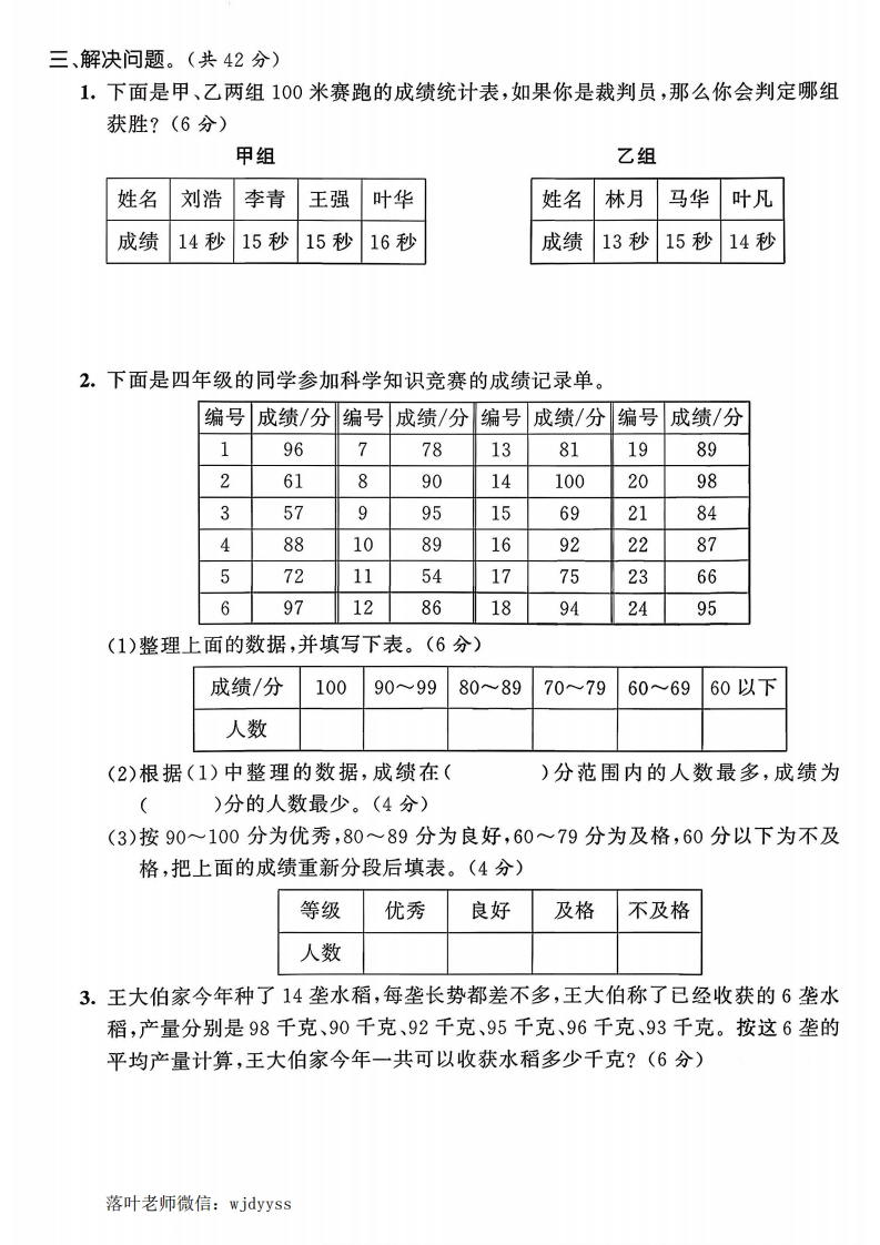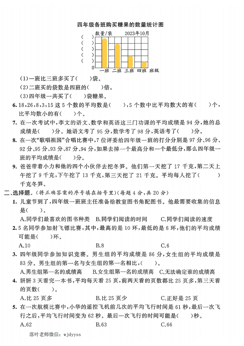 2025苏教版四年级上册数学综合提优测试卷第四单元综合提优卷题号四总分得分时间:70分钟满分:(100+10)分一、填空题。(第4题6分,第6题6分,第9题2分,其余每空1分,共38分)1.一个条形统计图用2格表示50人,平均每格表示()人,照这样计算,要表示150人需要画()格。2.光明汽车厂2023年下半年汽车产量统计图数量/辆2024年1月如发300050029封七月八月九月十月十一月叶二月(1)这幅统计图中每一格表示()辆汽车。(2)产量最少的是()月份,是()辆;产量最多的是()月份,是()辆;产量最多的月份与产量最少的月份汽车产量相差()辆。(3)光明汽车厂下半年平均每个月生产()辆汽车。3.气象小组的同学在一天内不同时间测得的温度如下表:时间2时8时14时20时温度/℃28343630(1)在这四个时间中,()时的温度最高,()时的温度最低。这一天的平均温度是()℃。(2)估计这一天所在的季节是一年中的()季。4.2022年女篮世界杯中,中国女篮荣获亚军,再创历史最好成绩。比赛时首先上场的5名队员身高分别是201厘米、207厘米、192厘米、176厘米、183厘米,这5名队员的平均身高不会小于()厘米,不会大于()厘米;如果将一名身高176厘米的队员换成一名身高195厘米的队员,这时场上队员的平均身高比原来的)(填“高”或“矮”)。5.下面是学校“迎国庆”联欢活动中四年级各班购买糖果的数量统计图,已知四年级三班比四年级四班多买了15袋。请完成统计图后填一填。落叶老师微信:wjdyyss