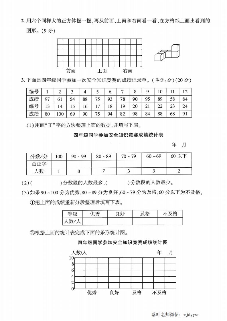 2025苏教版四年级数学上册单元测试卷第三、四单元测试卷器检测时间:90分钟满分:100分+10分题序二三四五附加题总分得分一、填空题。(22分)弥紫蓝红正方体的上面是()色,前面是()色。毁封2.观察时,从()面看和()面看到的图形是一样的。线3.五个数:2369、10,它们的平均数是(),比平均数大的数有()个。4.学校篮球队5名主力队员的身高分别是159厘米、172厘米、165厘米、170厘米、174厘米,这5名队员的平均身高不会低于()厘米,也不会高于()厘米。内5.李师傅5个星期共加工了490个零件,平均每个星期加工()个零件,平均每天加工()个零件。黛不6.看一看,填一填。(填序号)要①②③④(1)从前面看到的是(),从右面看到的是(答(2)从上面看到的是(),从前面看到的是(茶题7.用若干个小正方体拼一个立体图形,使得从右面和上面看到的都是要搭成这样的立体图形,最少需要()个小正方体,最多需要()个小正方体。8.上星期,四(1)班学生收集废纸情况如下表:组别第一组第二组第三组第四组收集废纸(千克)☒(1)平均每组收集废纸()千克。(2)第()组和第()组收集的废纸超过了平均数。径(3)第()组收集的废纸比平均数少()千克。(4)第一组收集的废纸是第三组的()倍。落叶老师微信:wjdyyss
