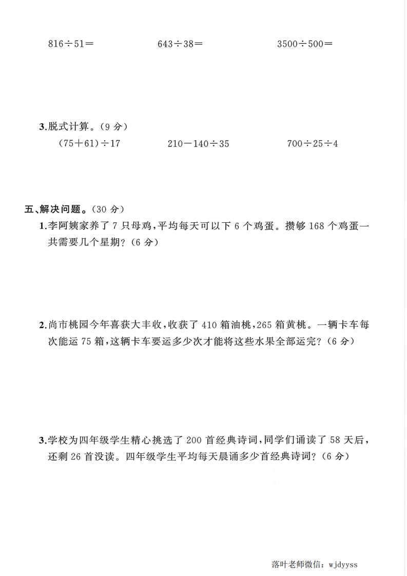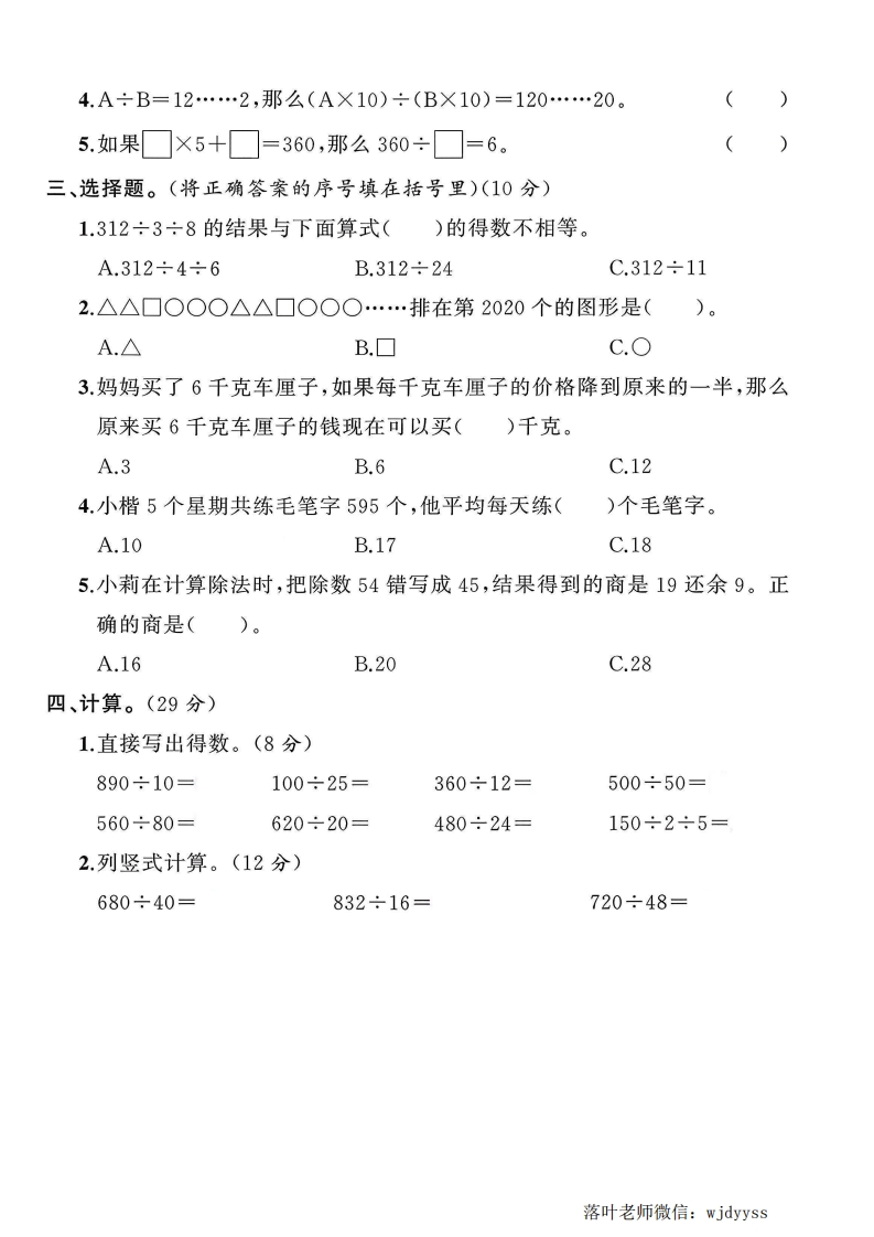 2025苏教版四年级数学上册单元测试卷:第二单元测试卷时间:90分钟满分:100分+10分题序二三四五附加题总分n得分一、填空题。(每空1分,共21分)1.856÷39的商是()位数;278÷35的商的最高位是()位。弥2.624是13的()倍;()个32是768。3.900分=()时660秒=()分648时=()日封繁4.要使84÷84的商是两位数,里最小填();要使商是一位数,☐线里最大填()。5.346÷32=10…26,如果被除数和除数同时乘10,那么商是(),余内数是()。6.☐÷25=24…,人最大是(),这时是()。爵不7.括号里最大能填几?40×()<28060×()<429要()×23<11041×()<2108.实验小学有一个面积是504m2的长方形花坛,已知它的长是28m,宽是管)m。毁9.把写着1~100号的100张卡片依次分发给甲、乙、丙三个人,25号卡片发题给了(),98号卡片发给了(10.在一道有余数的除法算式中,被除数、除数、商与余数的和是599。已知:商是15,余数是12,则除数是()。二、判断题。(对的画“√”,错的画“X”)(10分)(3)有)g1.三位数除以两位数,商可能是一位数,也可能是两位数。(2.计算358÷57时,把57看作60来试商,初商会偏大。3.936÷24=38…24。(落叶老师微信:wjdyy