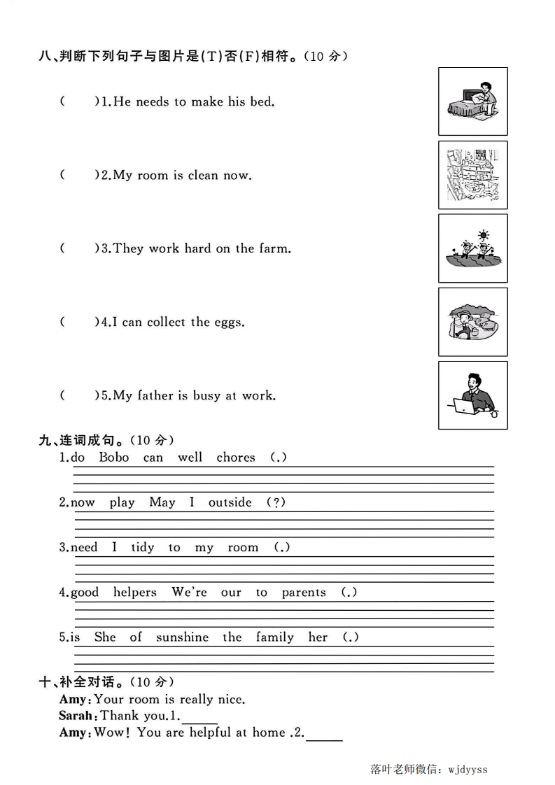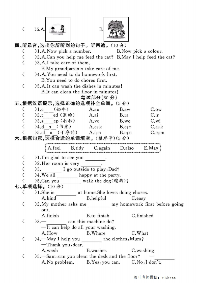 2025外研版四年级英语上册单元测试卷第二单元测试卷露检测时间:60分钟满分:100分题序三四五六七八九+十一总分得分听力部分(40分)弥一、听录音,选出你所听到的单词。听两遍。(10分)()1.A.washB.dishC.desk扫码听听力()2.A.jobB.floorC.chore封()3.A.cleanB.sweepC.pick()4.A.workB.waterC.yard(线)5.A.easyB.tiredC.tidy二、听录音,用数字1~5给你所听到的句子排序。听两遍。(10分)()Stop!It's so dirty now.内()May I go and play outside?()Can you clean your room first?)Can you help me take out the rubbish?蠻不()Oh,I'm still busy.三、听录音,选出与所听内容相符的图片。听两遍。(10分)要)1.AB答靠题)2.AB.)3.A.B@®)4.AB落叶老师微信:wjdyyss