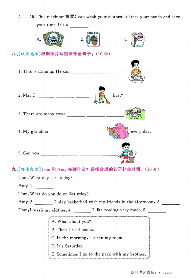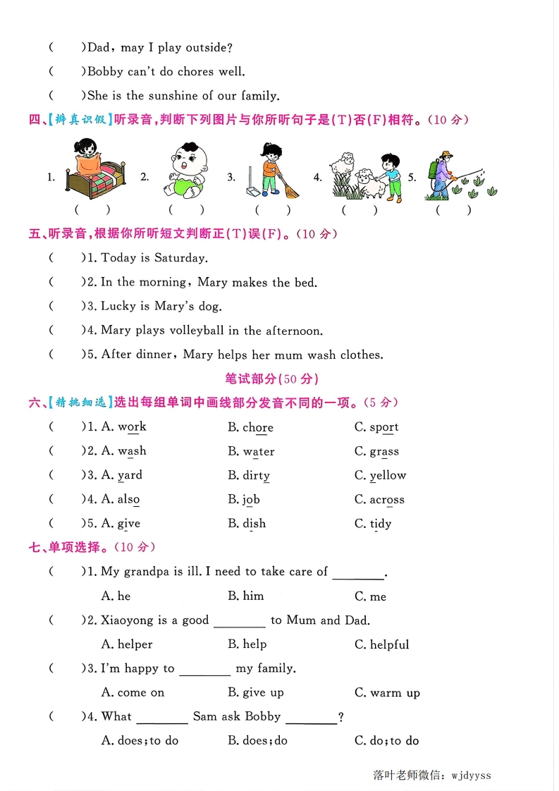 2025外研版四年级英语上册单元测试卷Unit2综合素养过关卷时间:60分钟书写等级:质量等级:▣3听力部分(50分)[听力帝频]一、听录音,选出你听到的单词。(10分)()1.A.fishB.dishC.dishes()2.A.helpB.helperC.helpful)3.A.whatB.waterC.wash()4.A.dirtyB.tiredC.clean()5.A.sweepB.grassC.desk二、听录音,选出与你所听句子相符的图片。(10分))2.A)3.A.)4.毁)5.A三、【先后有序】听录音,给下列句子标序号。(10分))I can feed the pigs)Let's water the vegetables on the farm.落叶老师微信:wjdyyss