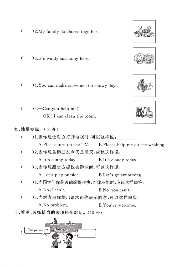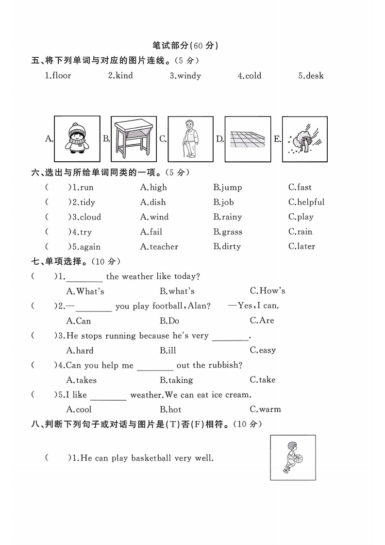 2025外研版四年级英语上册期中测试卷期中测试卷器检测时间:60分钟满分:100分题序三四五六七八九+十一总分得分听力部分(40分)弥一、听录音,选出你所听到的单词或词组。听两遍。(10分))1.A.cutB.coldC.clean扫码听听力毁封()2.A.feelB.keepC.sweep()3.A.pickB.pigC.cow线()4.A.sunnyB.snowyC.snow)5.A.turn onB.warm upC.give up内二、听录音,判断下列句子与所听内容是(T)否(F)相符。听两遍。(10分)()1.He can play ping-pong well.發不)2.I need to tidy the room first.)3.It's snowy and cold today.(要)4.Can you help me water the vegetables?()5.He wants to get money for the people.答三、听录音,用数字1~5给下列图片排序。听两遍。(10分)荞题())(四、听录音,给你所听到的句子选择正确的答语。听两遍。(10分))1.A.No,thanks.B.OK!()2.A.No,I don't.B.Yes,I can.因)3.A.Yes,I am.B.That's easy.)4.A.Well done.B.Sure!()5.A.It's sunny and warm.B.It's Monday today.
