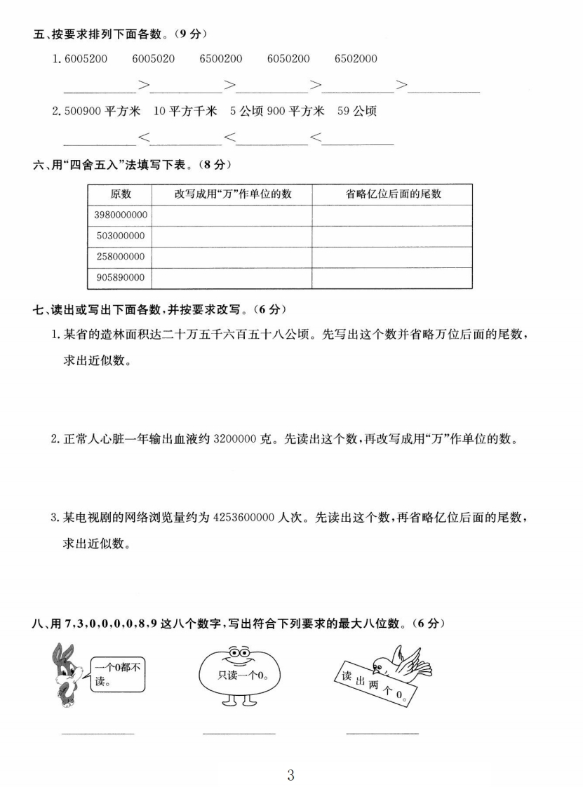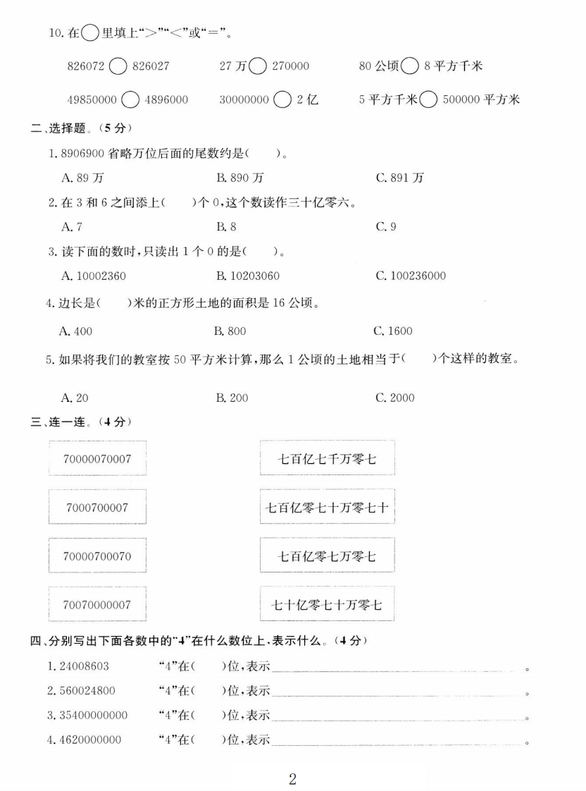 2025四年级上册数学第一次月考测试卷第一次月考测试卷时间:60分钟满分:100+10分题号三四五六七八九十总分附加题等级都得分如、填空题。(34分)数1.10个()是一百万:一亿里有100个(2.由4个亿、8个万、5个千组成的数是(3.最大的九位数加上()就是最小的十位数,最小的十位数改写成用“亿”作单位的数是(4.由2个“2”和4个“7”组成的最大的六位数是(),最小的六位数是()。5.一块长600米、宽400米的菜地的面积是()平方米,合()公顷。茶轲6.在()里填上合适的数字。600公顷=()平方千米3公顷=()平方米800000平方米=()公顷16平方千米=()公顷9平方千米=()公顷=()平方米7.在()里填上合适的面积单位。(1)一栋教学楼的占地面积约为580((2)天安门广场的占地面积约为40(赵北(3)河南省的面积约为17万(·)。8.里能填几?9670≈10万(4☐8203000≈5亿(29☐800≈29万(1862070000≈183亿(9.用计算器计算。315+478=326×573=22410÷18=5391-2467=848×806=10191÷43=1