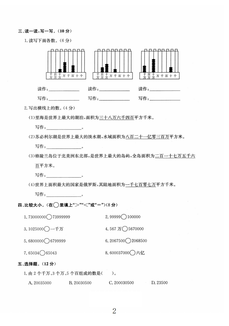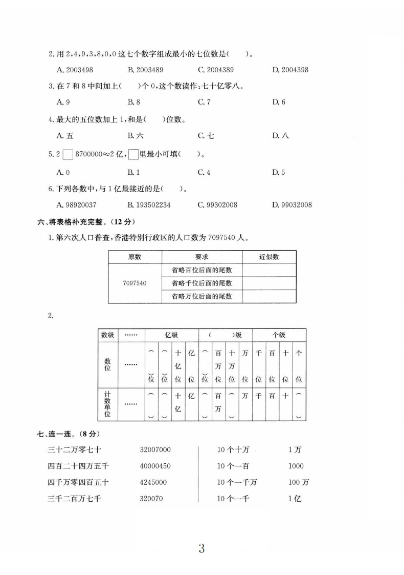 2025四年级上册数学第一单元测试卷第一单元测试卷时间:90分钟满分:100+10分题号四五六七八九总分附加题等级得分都如一、填空题。(20分)製1.在数位顺序表中,从右边起第七位是()位,第九位是()位。2.给多位数分级时,从()边起,每()个数位是一级。3.1978523040这个数的最高位是()位,其中5表示()4.()个一万是十万,()个十万是一百万,()个一百万是一千万,10个一千万是(5.6800000000=()万=()亿苏弼6.49☐800≈49万,☐里可以填(39☐8000000≈40亿,☐里可以填(7.40600700=40000000+()+(8.按要求写出下面各数。最小的九位数是(),最大的七位数是(9.一个数“四舍五入”后得到的近似数是50万,这个数最大可能是(),最小可能是(这).二、判断题。(6分)1.个、十、百、千、万…亿都是计数单位。(‘)2.读40025600时,只读一个零。()3.光明小学有43万名学生。()4.最小的自然数是1。()5.两个计数单位之间的进率都是十。()6.四年级(4)班有42人,全校有900多人,其中42和900都是准确数。()1
