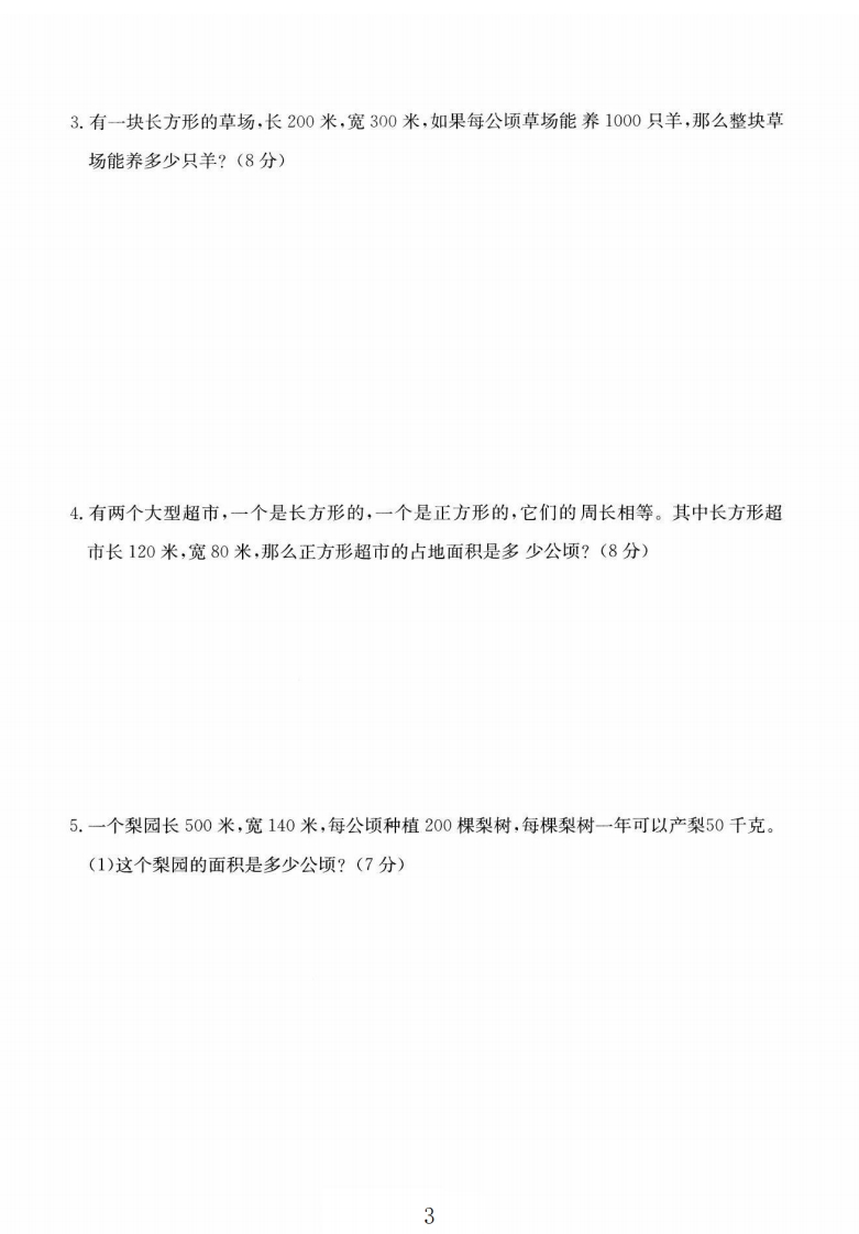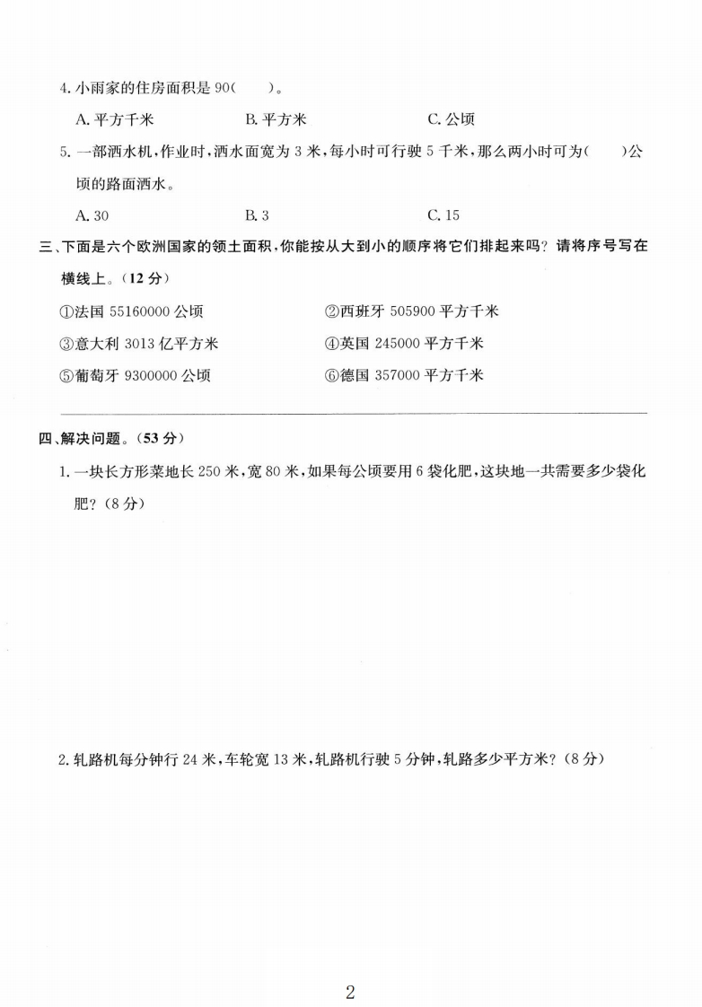 2025四年级上册数学第二单元测试卷第二单元测试卷时间:60分钟满分:100+10分题号三四总分附加题等级都得分一、填空题。(20分)如1.3500000平方米=()公顷12公顷=()万平方米32平方千米=()公顷155265平方米≈()公顷96000000平方米=()平方千米7800平方千米=()公顷4000公顷=()平方千米835平方千米=()公顷2.在括号里填上合适的单位。(1)一所小学的占地面积大约是5((2)我国领土面积大约是960万(辐封(3)我们教室的占地面积大约是50()。(4)一块鱼池的占地面积大约是2300(3.比较大小。3公顷○2900平方米200公顷○2平方千米4平方千米○404公顷8000平方米○8公顷70公顷○7平方千米9平方千米○90公顷6公顷○60000平方米200公顷○1平方千米邻期二、选择题。(15分)1.测量比较大的土地面积,常用()作单位。A.平方米B.平方千米C.公顷2.一个长方形码头长2500米,宽20米,这个码头的占地面积是()公顷。A.5B.50C.50003.天安门广场南北长约800米,东西长约500米,那么天安门广场约占地()公顷。A.400B.40C.41