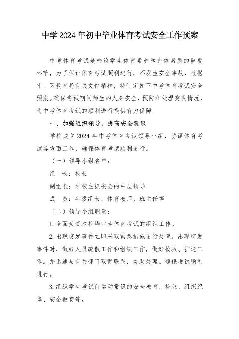 中学2024年初中毕业体育考试安全工作预案中考体育考试是检验学生体育素养和身体素质的重要环节,为了保证体育考试顺利进行,不发生安全事故,根据市、区教育局有关文件精神,特制定如下中考体育考试安全预案。确保考试期间师生的人身安全,预防和处理突发情况,为中考体育考试的顺利进行提供有力保障。一、加强组织领导,提高安全意识学校成立2024年中考体育考试领导小组,协调体育考试各方面工作,确保体育考试顺利进行。(一)领导小组名单:组长:校长副组长:学校主抓安全的中层领导成员:年级组长、体育教师、班主任等(二)领导小组职责:1.全面负责本校毕业生体育考试的组织工作。2.出现突发事件立即采取紧急措施进行处置,出现突发事件时,做好人员疏散工作和组织工作,做好抢救、护送工作。并迅速与有关部门取得联系,协助处理。确保考试顺利进行。3.组织学生考试前运动常识的安全教育、检录、组织纪律、安全教育等。