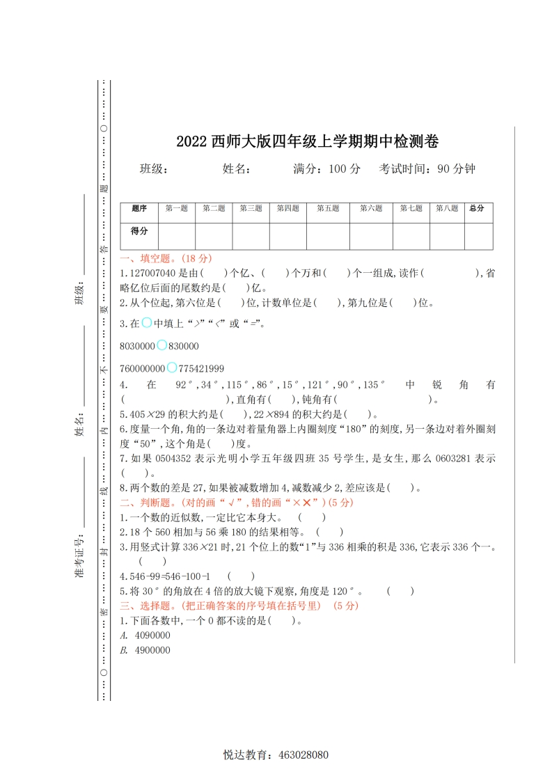 .....◎2022西师大版四年级上学期期中检测卷班级:姓名:满分:100分考试时间:90分钟题序第一题第二题第三题第四题第五题第六题第七题第八题总分得分一、填空题。(18分)1.127007040是由()个亿、()个万和()个一组成,读作(),省略亿位后面的尾数约是()亿。2.从个位起,第六位是()位,计数单位是(),第九位是()位。3.在○中填上“)”“”或“”。8030000○830000长760000000●)7754219994.在92°,34°,115°,86°,15°,121°,90°,135中锐角有(),直角有(),钝角有()。5.405X29的积大约是(),22X894的积大约是()。6.度量一个角,角的一条边对着量角器上内圈刻度“180”的刻度,另一条边对着外圈刻度“50”,这个角是()度。7.如果0504352表示光明小学五年级四班35号学生,是女生,那么0603281表示.:容8.两个数的差是27,如果被减数增加4,减数减少2,差应该是()。二、判断题。(对的画“√”,错的画“××”)(⑤分)1.一个数的近似数,一定比它本身大。()2.18个560相加与56乘180的结果相等。()3.用竖式计算336×21时,21个位上的数“1”与336相乘的积是336,它表示336个一。(4.54699546-100-1()5.将30°的角放在4倍的放大镜下观察,角度是120°。()感三、选择题。(把正确答案的序号填在括号里)(5分)】1.下面各数中,一个0都不读的是()。A.4090000B.4900000悦达教育:463028080