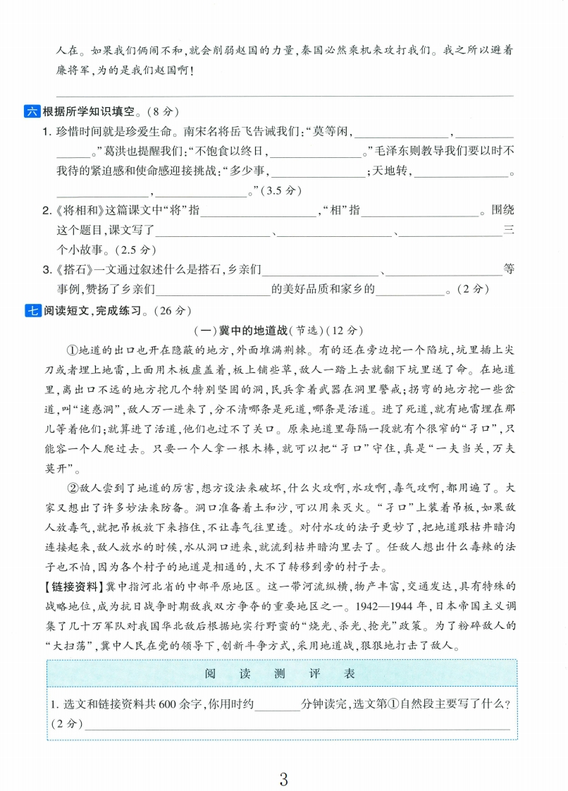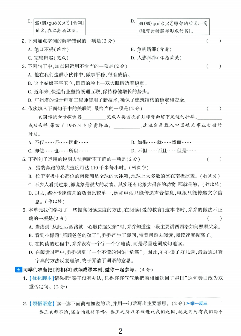 2025人教版五年级语文上册第二单元测试卷第二单元测试卷时间:90分钟满分:100分题号二三四五六七八总分孙得分一用“√”选出加点字正确的读音。(6分)岔路(càchà)削弱(uēxiāo)击缶(fuǒfǒu)间隙(ianjian)客卿(qing qin)擅长(san shan)羞辱(rǔrù)抵御(yùyd)1.为了出色地完成这项任(rnrn)务,她坚持每天加强(giang giang)练习。2.她在获得世界冠(guanguan)军后依I旧不骄不躁,按原定计划(hua hud)投入到训练中。已新素养时事热点看拼音,写字词,把红领巾广播站的新闻稿补充完整。(8分)1.“tian gong()”又来人啦!北京时间2025年4月24日17时17分,搭载神舟二十号载人飞船的长征二号F遥二十运载huǒjiàn()在酒泉卫星发射中心成功发射。shige)数月,中国航天探索的脚步再次迈出坚实的一步。2.2025年我们迎来了抗战胜利80周年,曾经,在民族危亡之际,我们dǎg(li wan kuanglan澜),领导中国人民抵抗外敌的qim心è(),zhùqi()了一道道坚不可摧的bǎo()垒,捍卫了民族的尊严。目将下列成语补充完整,再按要求回答问题。(6分)>举一反三①()穷()尽②()价之()③()心()力④不计()(爵⑤难以()()⑥理所()()⑦()()圆睁⑧()好无()1.选词填空:我国航天事业经历了60余年的发展,从无到有,取得了令全世界的伟大成就。这是航天科技工作者们的奋斗结果。(填序号)(1分)2.仿照示例,用具体的情景将词语⑦表现出来。(1分)例:左右为难:大家说秦王不过是想把和氏壁骗到手罢了,不能上他的当;可要是不答应,又怕他派兵来进攻。四选择题。(12分)1.乔乔读完秋瑾的故事后,写下了这句感想:所谓巾gu6不让须眉,秋瑾当为第一人。她不会写“gu6”,便查了字典,她应该选(2分)(A.掴(搁)gu6《×乙(又)见guai。掴(摑)guāi帼(幗)gu6《X乞古代妇女包头《X万guó《X乞(又)打耳光:被了一记耳光.的巾、帕:巾~英雄(女英雄)。