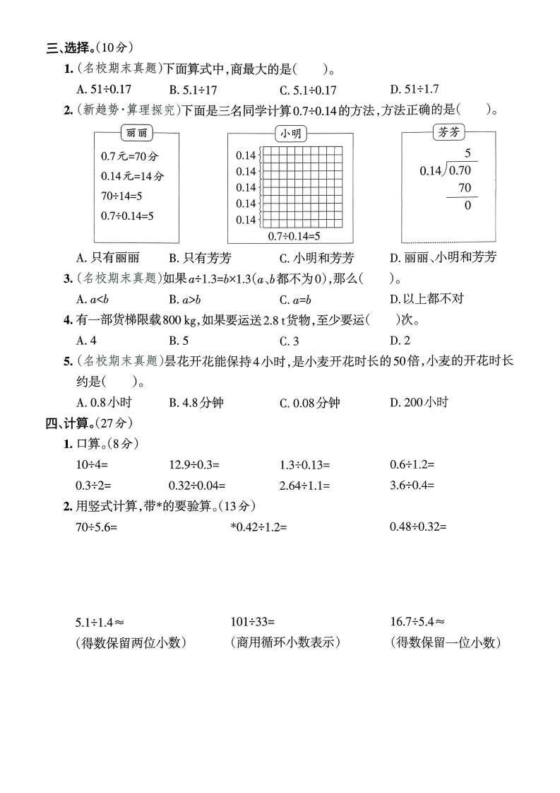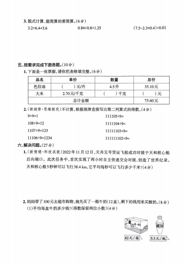 2025-2026学年人教版五年级上册数学综合素养评价第三单元综合素养评价时间:60分钟满分:100+10分题序三四五六附加题总分等级得分垫孔一、填空。(每空1分,共21分)1.6.4÷0.004的商的最高位是()位。2.3.296的循环节是(),保留三位小数约是(敏),保留两位小数约是()3.(名校期末真题)在3.1415926…,12.383,1.01,9.16666…中,()是有限小数,()是无限小数,()是循环小数。4.在○里填上“>”“<”或“=”。2.4÷1.22.40.35÷0.990.351.8÷2.10.56÷1.65.6÷165.根据34.56÷2.7=12.8,在下面括号里填上适当的数。345.6÷()=12.834.56÷0.27=(3.456÷27=()6.(名校期末真题)在0.90,0.939,0.93,0.939这四个数中,最大的数是(),最小的数是()。7.(新情境·传统文化)剪纸是中国最古老的民间艺术之一。张阿姨0.25小时可以剪40个窗花,平均每小时剪()个窗花,平均剪一个窗花需要()小时。蜗8.两个数相除,商是21.7,如果把被除数的小数点向右移动两位,除数的小数点向左移动一位,它们的商是()。9.(新情境·社会热点)杭州亚运会主办城市推广曲《最美的风景》正式推出,五(1)班练习合唱这首歌,如果练习一次需要用4.5分钟,30分钟最多能练习()次。超10.把一个数的小数点向右移动一位后,得到的数比原来大29.7,这个数原来是(二、判断。(5分)1.3.7÷0.5的商是7,余数是2。2.0.1939393…可以简写成0.193。(荪点3.(名校期末真题)0.125×8÷0.125×8的结果等于1。(4.3.7除以7.3的商保留两位小数是0.50。(5.一个数除以0.85,所得的商一定比这个数小。(