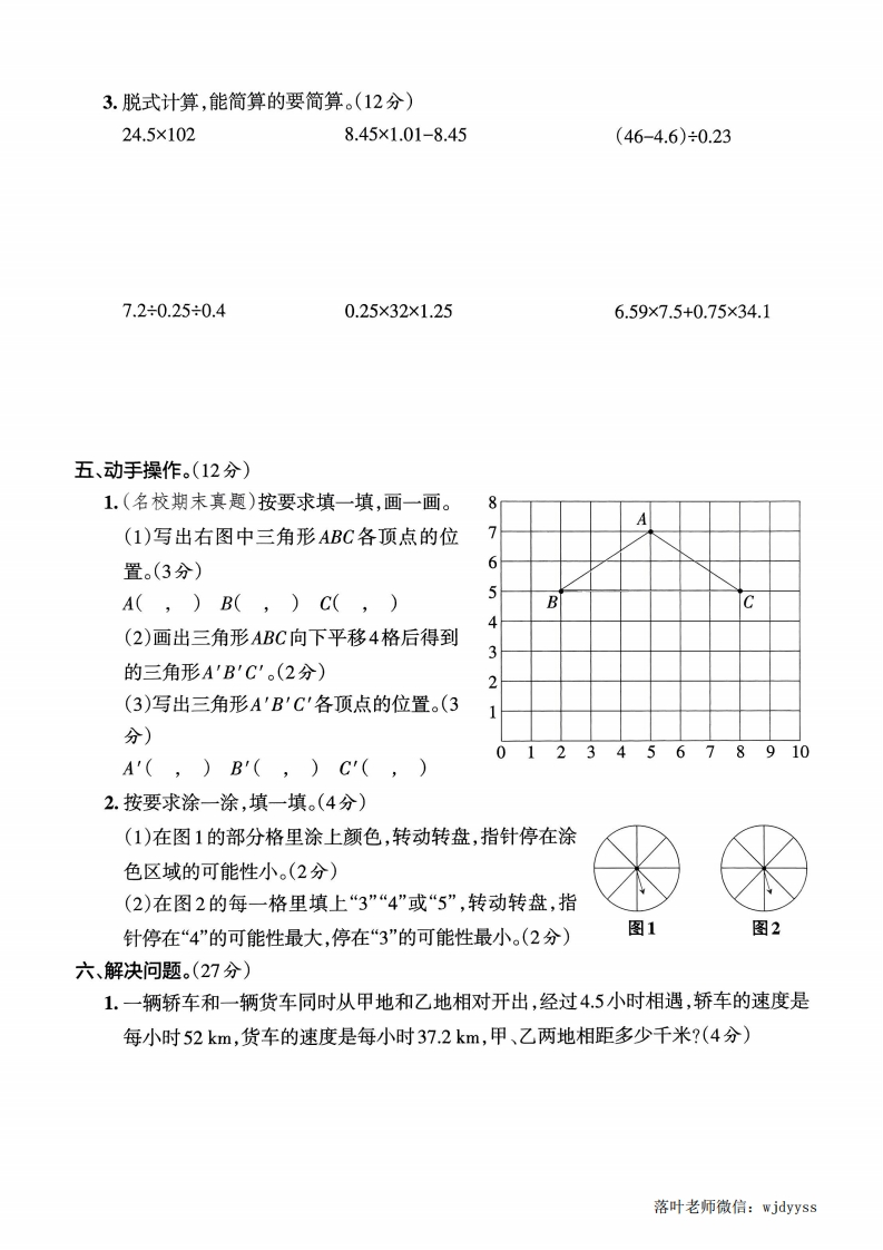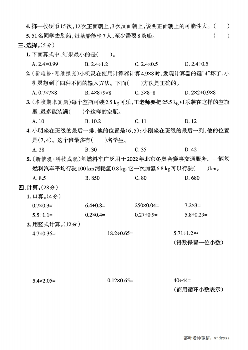 2025-2026学年人教版五年级上册数学综合素养评价期中试卷时间:90分钟满分:100分题序二三叫五六总分等级得分种孙一、填空。(每空1分,共23分)1.0.38×0.16的积是()位小数,3.570.28的商的最高位是()位2.根据37×45=1665,直接写出下面各式的得数。3.7×4.5=(0.37×450=(16.65÷37=(166.5÷3.7=(3.(名校期末真题)在O里填上“>”“<”或“=”。5.62×0.95.621.35÷0.381.35×0.861.45○1.45毁长0.98÷1.010.981÷5.15.1÷15.605.6664.一个三位小数用“四舍五人”法保留两位小数后约是4.00,这个三位小数最大是),最小是()。5.200÷11的商用循环小数表示是(),循环节是(),保留两位小数是()o6.(名校期末真题)计算1口.6÷11,当☐里填()时,商的十分位上唱歌跳舞是0。朗诵唱歌7.转动右边的转盘,指针停在()的可能性最大。唱歌跳舞器8.(名校期末真题)数学课上,小亮坐在教室的第5列、第3行,用数跳舞唱歌对(5,3)表示,小明坐在小亮正后方的第一个位置,小明的位置用数对表示是(,)。9.(名校期末真题)用一台收割机收割大豆,2天可以收割9.6公顷。照这样计算,7天可以收割()公顷,62.4公顷大豆需要()天才能收割完。10.小刚在计算某数除以1.2时错把除号看成乘号,算得结果是5.04,正确的商应该是()。二、判断。(5分)荪齒1.0.999×1.01的积大于0.999且小于1.01)2.一个数除以一个小数,商一定大于这个数。()3.如果a÷0.1=3,那么(a×100)÷(0.1×100)=300。()落叶老师微信:wjdyyss