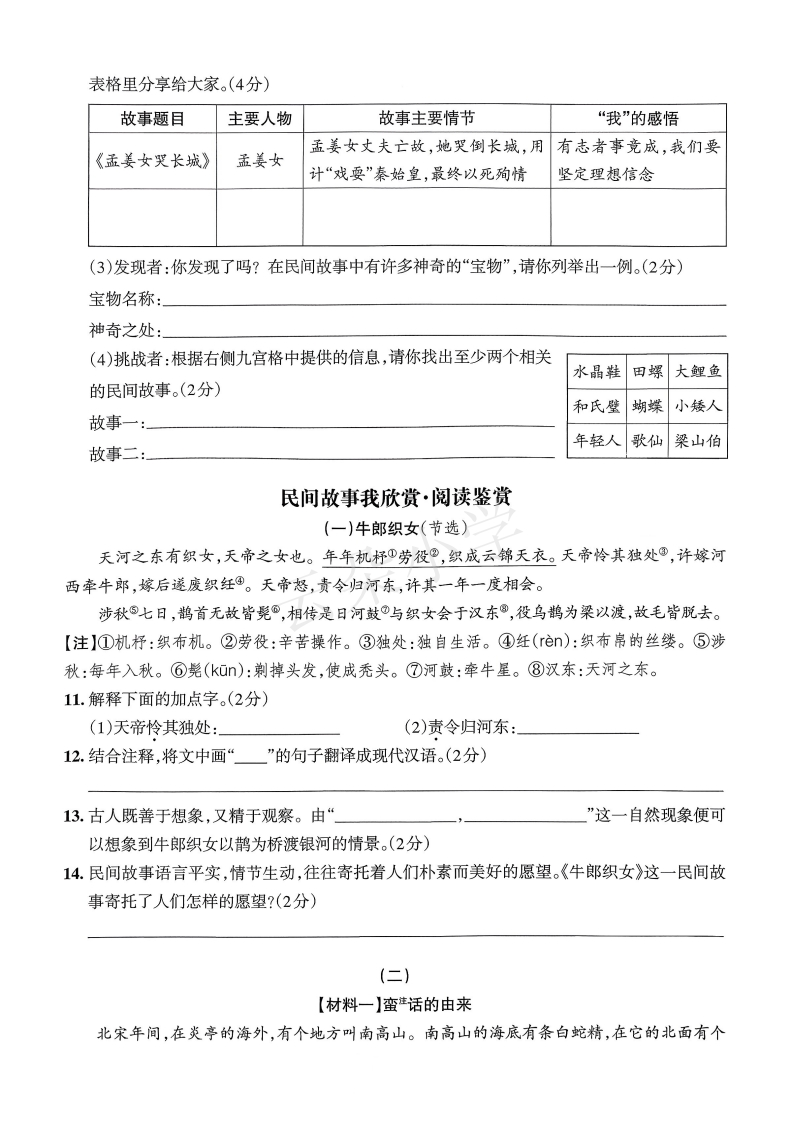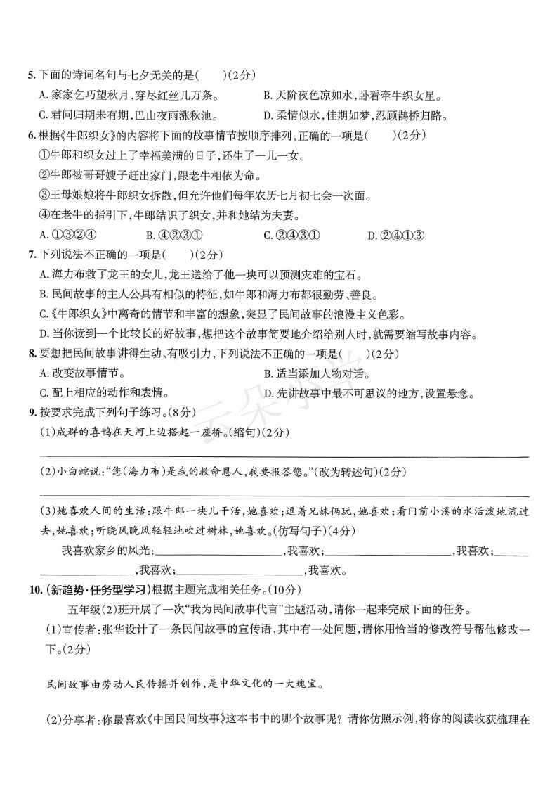 2025-2026学年五年级上册语文情境素养卷第三单元情境素养卷时间:90分钟满分:100分民间故事是口耳相传的经典,是前人留给我们的智慧结晶。让我们一起走近民间故事,去感受它的神奇与魅力吧!你民间故事代代传·积累运用1.找出每组中加点字读音错误的一项,将序号写在后面的括号里。(4分)》(1)A.梭子(suō)孙B.依偎(wei)C.珊瑚(shan)D.牺牲(灯)(2)A.筛选(sai)B.结婚(hūn)C.礁石(jiāo)D.竹筐(kuang)((3)A.誓言(shi)B.酿酒(niàng)C.勒恳(kěn)D.拗不过(yòu)(4)A.节俭(jiǎn)B.瞌睡(k)C.衰老(sudi)D.丢三落四(Ià)2.根据拼音写词语。(8分)小军不Xi han()零食和玩具,就喜欢收藏民间故事书。他常常被书里的故事吸..引,比如读到“只听一声zhèn tian dòngdi()的巨响,大山beng ta()妆了”这句话时,他也不由自主地紧张起来。有同学向他借书,他毫不chi yan(),却也封会ding zhǔ()他们要爱护图书。可是,今天同桌问小军有没有《八仙过海》这本书时,小军shuo huǎng()了,他不舍得把自己最喜爱的书借给别人,但看到同桌失望的表情,小军又有些hou hut(),最终把书借给了同桌。3.按要求完成练习。(6分)“酬”用音序查字法查字典,应先查音序再查音节这个字在字典中的解释是:①主人向客人敬酒;②报答;③报酬;④实现;⑤交际往来。请你给下面句子中加点的“酬”选择合适的解释(填序号)。(1)我是龙王的女儿,您跟我回去,我爸爸一定会好好酬谢您。((2)他们在同一家工厂工作,同工同酬。()(3)他不善于应酬,不知道怎么办才好。(线(4)这首诗表现了作者壮志未酬的惆怅。()4.下列句子中,加点的俗语与括号中的成语意思不同的一项是()(2分)A.我们要吃水不忘挖井人,永远铭记为今日之幸福而牺牲的革命先烈。(饮水思源)B.老乡握着红军的手说:“我们盼星星盼月亮,总算把你们盼来了。”(左顾右盼)C.爸爸语重心长地对小明说:“学习不能当一天和尚撞一天钟,成绩不会陪你演戏。”(得过且过)D.咱们打开天窗说亮话吧,这损人利己的事,我们不能干。(直言不讳)