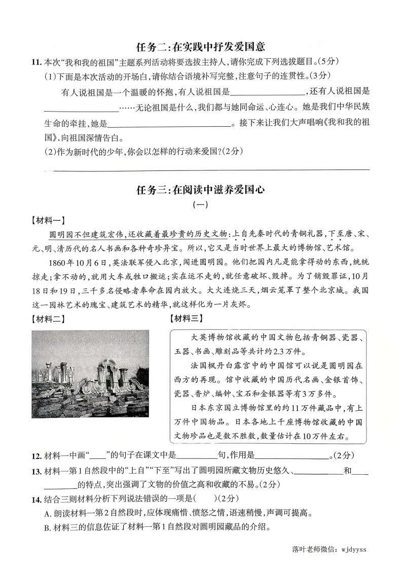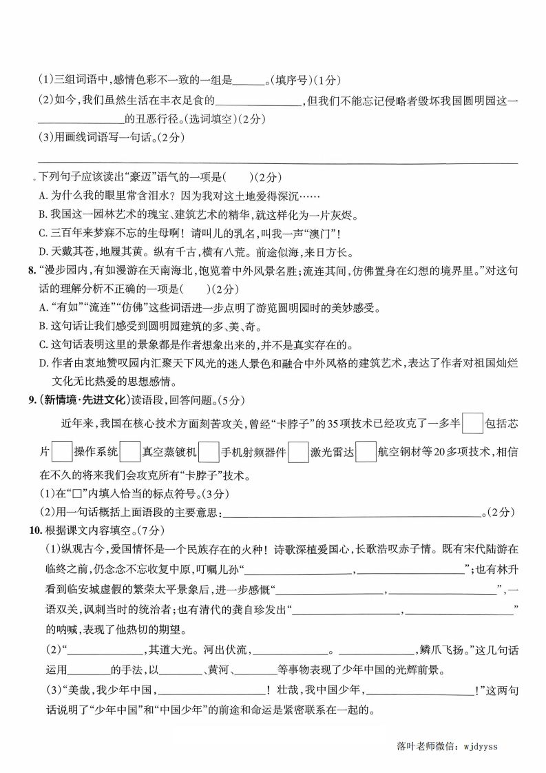 2025-2026学年五年级上册语文情境素养卷第四单元情境素养卷时间:90分钟满分:100分“天下兴亡,匹夫有责。”古往今来,中国人的爱国情怀代代相传。近期,学校组织开展了“我和我的祖国”主题系列活动,请你参与并完成下列任务。弥任务一:于词句中体会爱国情1.默写《示儿》,注意书写要求。(3分)示儿⊙每一行诗句都居中写,注意上下、左右文字要对齐。○注意笔画、结构等方面的细节。陆游诗毁2.(名校期末真题)根据拼音写词语。(7分)》封夜幕退场,随着东方的第一道曙光,这座jǔshi wen ming()的皇家gong dicàn)便呈现在我们眼前:jin bi huT huang()的建筑鳞次栉比,假山、花卉富有shT qing hua yi(),一切都相得益彩、相映成趣。3.下面加点字的读音全都正确的一项是()(2分)A.美哉(zdi)灰烬(in)炊烟(chui)玲珑剔透(t)B.抖数(sǒu)快艇(ting)波澜(In)不可估量(g0)C.舀水(yo)汤勺(shao)履行(Iǚ)鳞爪飞扬(lin)D.亥时(hai)自恃(shi)震惶(huang)武陵春色(ling)4.下列词语中书写全部正确的一项是()(2分)A.边僵仿照不拘一格B.奉命尝拭一泻千里C.搬运象征众星拱月D.潜水悲哀搏物馆线)5.下列加点字的解释不正确的一项是()(2分)A.死去元知万事空(同“原”,本来)B.地履其黄(踩、踏)C.干将发硎(磨刀石)D.九州生气恃风雷(害怕)6.将词语补充完整,并按要求完成练习。(11分)①太平()世路不拾(人()年丰)通人和②兵()马乱哀()遍野生灵()炭内忧外()③足()多谋呕心()血得()忘形()名远扬落叶老师微信:wjdyyss