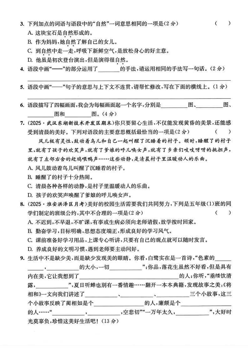 2025-2026学年五年级上册语文情境主题卷第一次月考卷时间:90分钟满分:100分什么是美好?总有人苦苦追寻它的真谛。为此,给力小学五年级(1)班开展了“向着美好出发”生活微镜头实践活动,请你一起来参与。。镜头一美好生活需留心·“自古逢秋悲寂寥,我言秋日胜春朝。”生活中处处皆是风景:日月星辰、花草树木,阳光雨露…只要我们稍加留意,便能收获不一样的美好。⌒秋日huang hun(),漫步在铺满落叶的林间【ji问njiàn】小路,听虫鸣声声,看白鹭you ran(),闻桂花飘香,任【rénrèn】思绪纷飞,收获一份难得的宁静。虫鸣声找不到来处,只觉从四面八方传来,仿佛是在开一场别致的音乐会。白鹭从幽【y6you】深的林中飞出,g0di()地待【dai dai】在水上,那身姿如此xi怕tido)而充满měign()。还未看到guai jicǎo()处的那棵桂花树,就闻到了熟悉的花香,真是沁人心脾。待【d6idài】走近,便看见的小花点缀其间,仿佛是星星坠落人间,的是,桂花树的样子笨笨的,不像梅树那样有姿态。但谁又能说桂花是自然的en()赐呢?这些看似dnch6ng()的景致让人由衷地cheng zan(),是真正的。继续毫无计划【hu问hua】地漫游,于一处liang ting()中,听老人讲述过去的故事,也别有一番yùn银)致…1.根据拼音写字词,并用“√”选择正确的读音。(13分)2.把下列词语补充完整,并完成练习。(10分)左()为()()()十足()计其()所当(难以()()无()()宝同()()力美()不((1)选择恰当的词语填人语段中的横线上。(3分)(2)与上面画“一”词语意思相近的四字词语有,意思相反的四字词语有」。(1分)(3)照样子,把画“一一”词语的意思用具体的情景表现出来。(2分)例:全神贯注—2025年国际射联射击世界杯女子10米气步枪决赛中,王子菲自信地走上赛场。她托起枪,凝神瞄准目标,丝毫没有受到周边环境的影响。她聚精会神地叮着前方,然后果断扣动扳机,成功收获个人的首枚世界杯金牌。