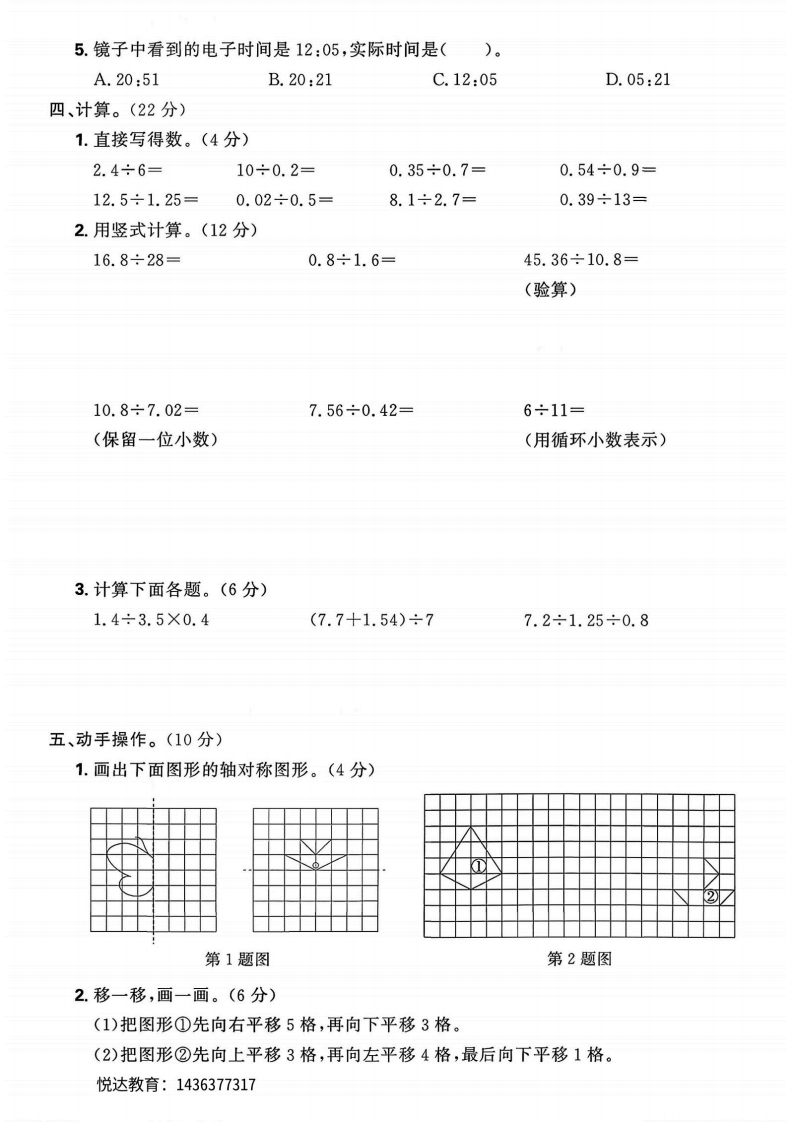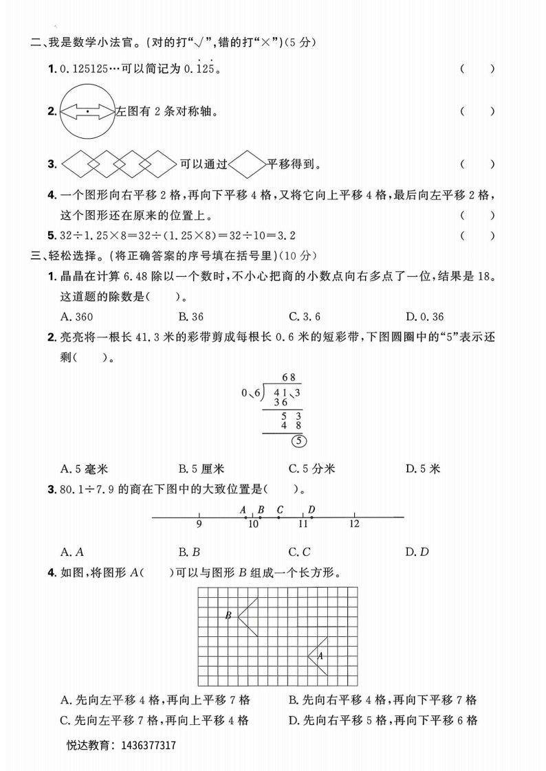 2025-2026学年北师版五年级上册数学月考真题卷第一阶段核心素养测评卷(月考一)⊙时间:60分钟义满分:100分题号三四五六总分等级得分一、小小填空,奥秘多。(27分)1.0.387÷0.45时,去掉除数的小数点把它变成45,要使商不变,被除数应变为()。2.把算式2.04÷0.34的除数和被除数同时扩大到原来的8倍,商是();如果被密除数不变,除数除以0.2,商是(3.15分=()时37.5米=()千米4.在6.37,6.37,6.37三个数中,最大的是(),最小的是()。5.一个除法算式的商是一个三位小数,保留两位小数是8.50,这个商最大是(封最小是()。游乐场项目价格表6.丽丽周末到游乐场玩,游乐场的项目价格表如图,她碰碰车7.5元/次带了50元,玩了一次激流勇进后,剩下的钱最多还卡丁车8元/次激流勇进20.9元/次能玩()次碰碰车。7.在○里填上“>”“<”或“=”。线蜜3.62○3.624.58÷0.5○4.582.377÷0.66○2.3771.904○1.90418.6÷1.6○18.63.76÷1.8○37.6÷188.1美元兑换人民币6.31元,小兰的爸爸在美国出差时,购买了一部手机,花了396.8美元。这部手机折合人民币大约()元。(保留整数)9.佳佳带100元去超市购买饮料,饮料标价每瓶4.5元。佳佳最多能买()瓶饮料。如果把这些饮料每6瓶装一盒,需要()个盒子才能装下。豁10.如右图,移动图A和图B,与图C拼成一个轴对称图案。(1)图A先向()平移()格,再向()平移()格。(2)图B先向()平移()格,再向()平移()格。悦达教育:1436377317