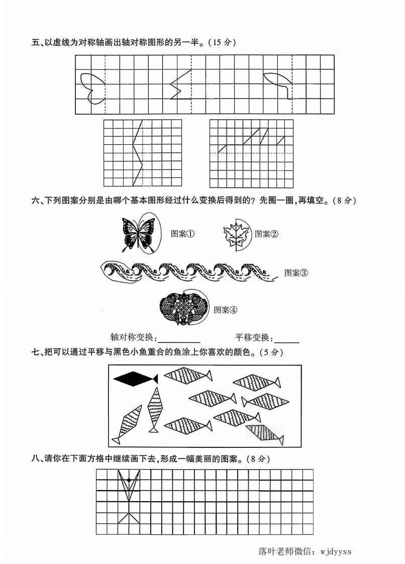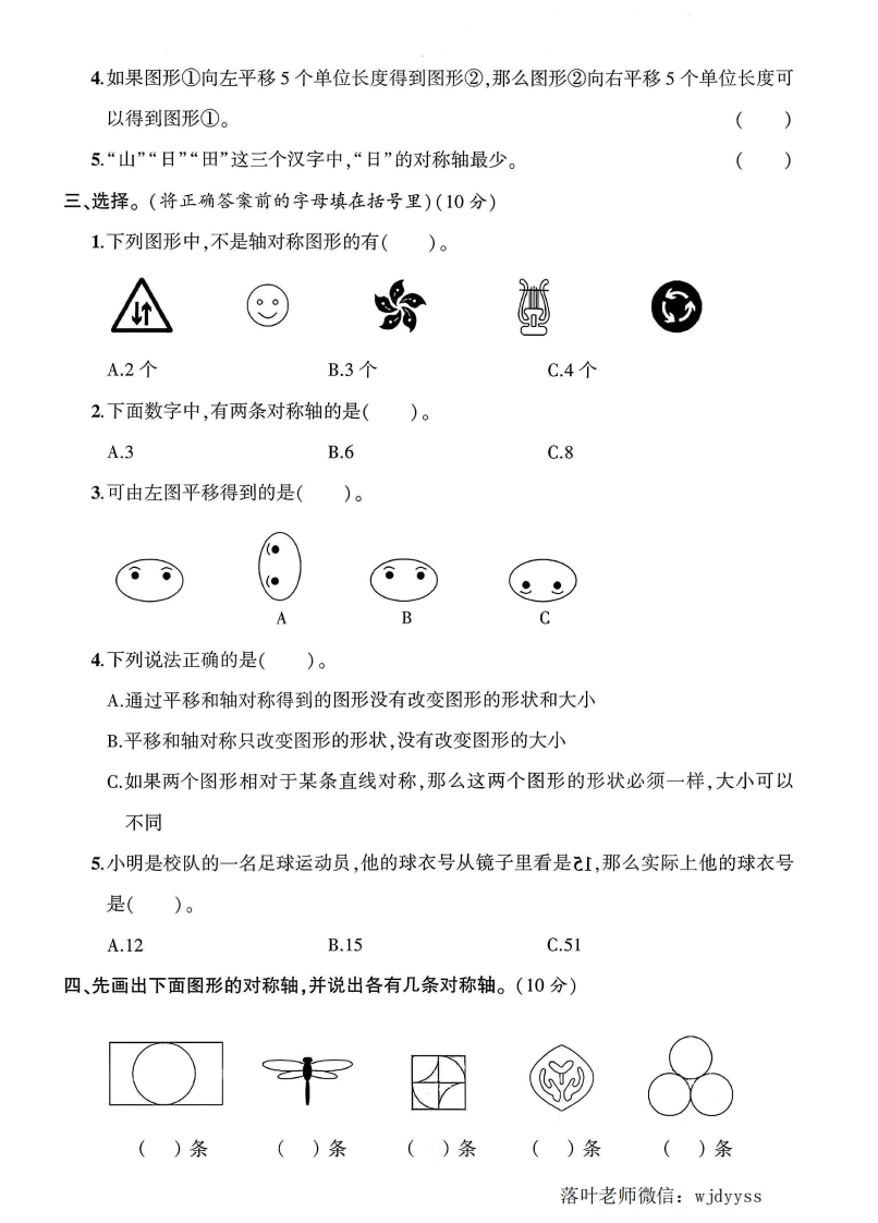 2025北师大版五年级数学上册单元测试卷第二单元测试卷检测时间:90分钟满分:100分+10分题序二三四五六七八九十十附加题总分得分一、填空。(每空1分,共15分)弥1.轴对称图形沿着()折叠,两侧的图形能够完全重合。2.下列物体的运动是平移的画“△”,不是平移的画“O”。毁封线(3.长方形有()条对称轴,圆有()条对称轴。内4.如图,对应点A与A'到对称轴的距离都是()小格;薰对应点B与B到对称轴的距离都是()小格:不对应点C与C到对称轴的距离都是()小格;成轴对称的两个图形的特征是对应点到对称轴的距离()。要答靠题第4题图第5题图5.如图,方格纸上的梯形①先向()平移()格得到图形②,再向()平移()格得到图形③。二、判断。(对的画“√”,错的画“X”)(5分)1.风吹动小风车是平移现象。☒2.右图是轴对称图形,它只有一条对称轴。e3.生活中利用平移和轴对称可以设计出许多美丽的图案。落叶老师微信:wjdyyss