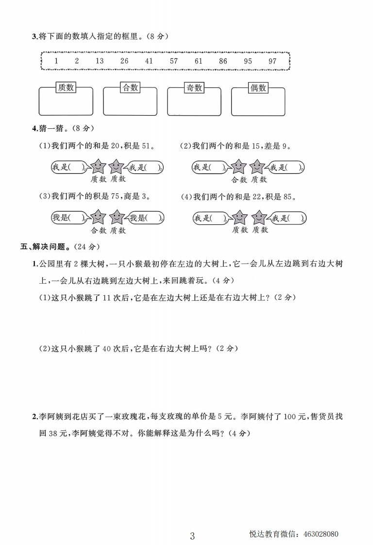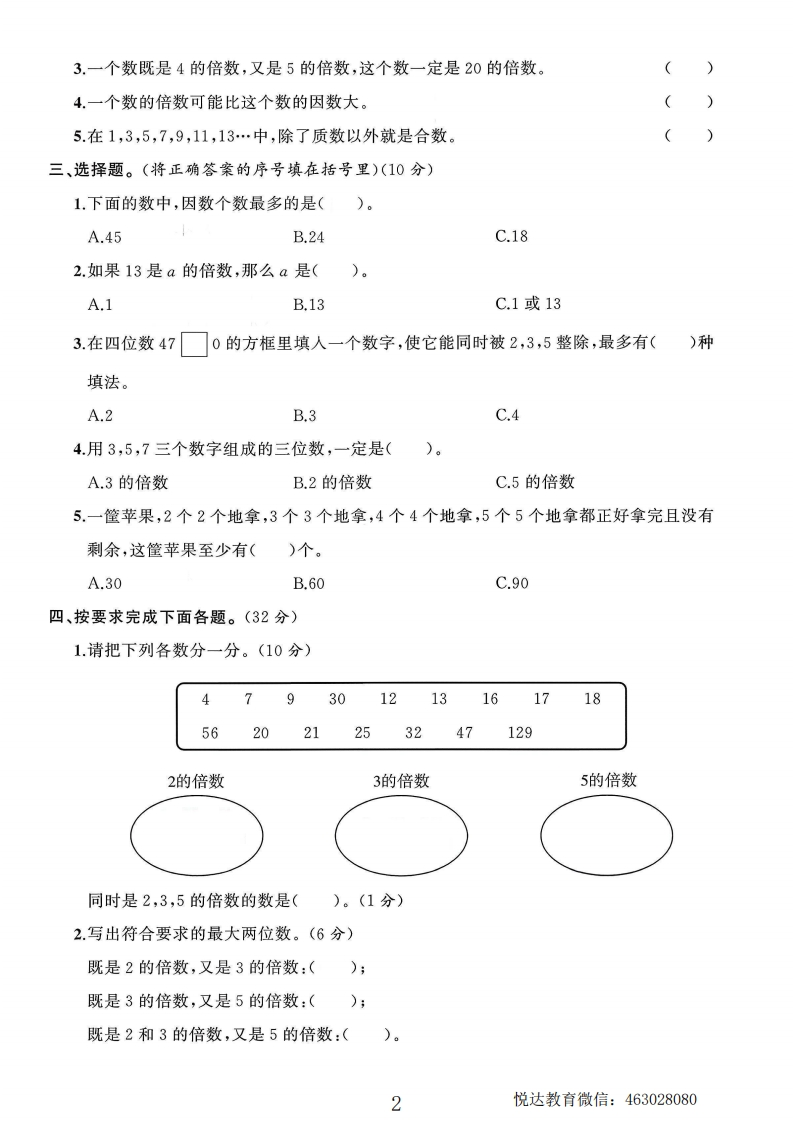 2025北师大版五年级数学上册单元测试卷第三单元测试卷时间:90分钟满分:100分+10分题序三四五附加题总分鄂得分、填空题。(每空1分,共29分)1.如果18÷3=6,那么18是()和()的倍数,3和6是18的(弥2.15的因数有()个,其中最小的是(),最大的是();30的倍数有()个,其中最小的是()。封3.在15,18,25,30,19,150,5550中,既是3的倍数,又是偶数的是();靠既是5的倍数,又是奇数的是();既是2,5的倍数,还有因数3的是线()。4.在自然数1~10中,()是偶数但不是合数;()是奇数但不是质数;10以内所有内质数的和是()。:5.要使42是2的倍数,又是5的倍数,里应填();要使35是2的倍数,又量不是3的倍数,里应填()。6有一个三位数,它的个位上的数是最小的质数,十位上的数是最小的合数,最高位上的要数既不是质数,也不是合数,这个数是()。7.如果1856是3的倍数,那么里最小能填(),最大能填()。8.把下面各数写成几个质数相加或相乘的形式。毁18=()十()20=()+(题15=()X(105=()X()X()9.小强家的WIFI密码是6位数字(记为ABCDEF)。已知A是最小的奇数;B既是奇数:又是合数;C既是质数又是偶数;D是最小的合数;E是一位数中最大的偶数;F只有一:个因数。这个WIFI密码是()。二、判断题。(对的画“√”,错的画“X”)(5分)1.合数就是偶数,质数就是奇数。():2.因为15÷0.3=50,所以0.3和50都是15的因数,15是0.3和50的倍数。1悦达教育微信:463028080