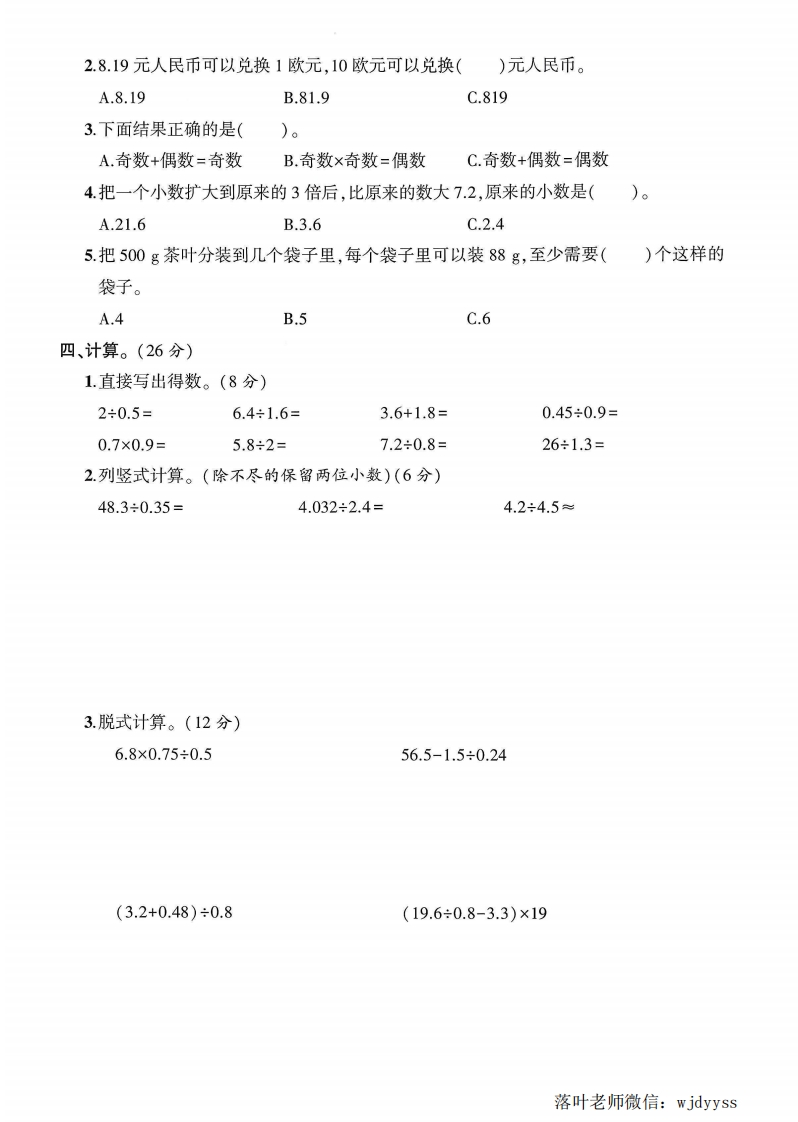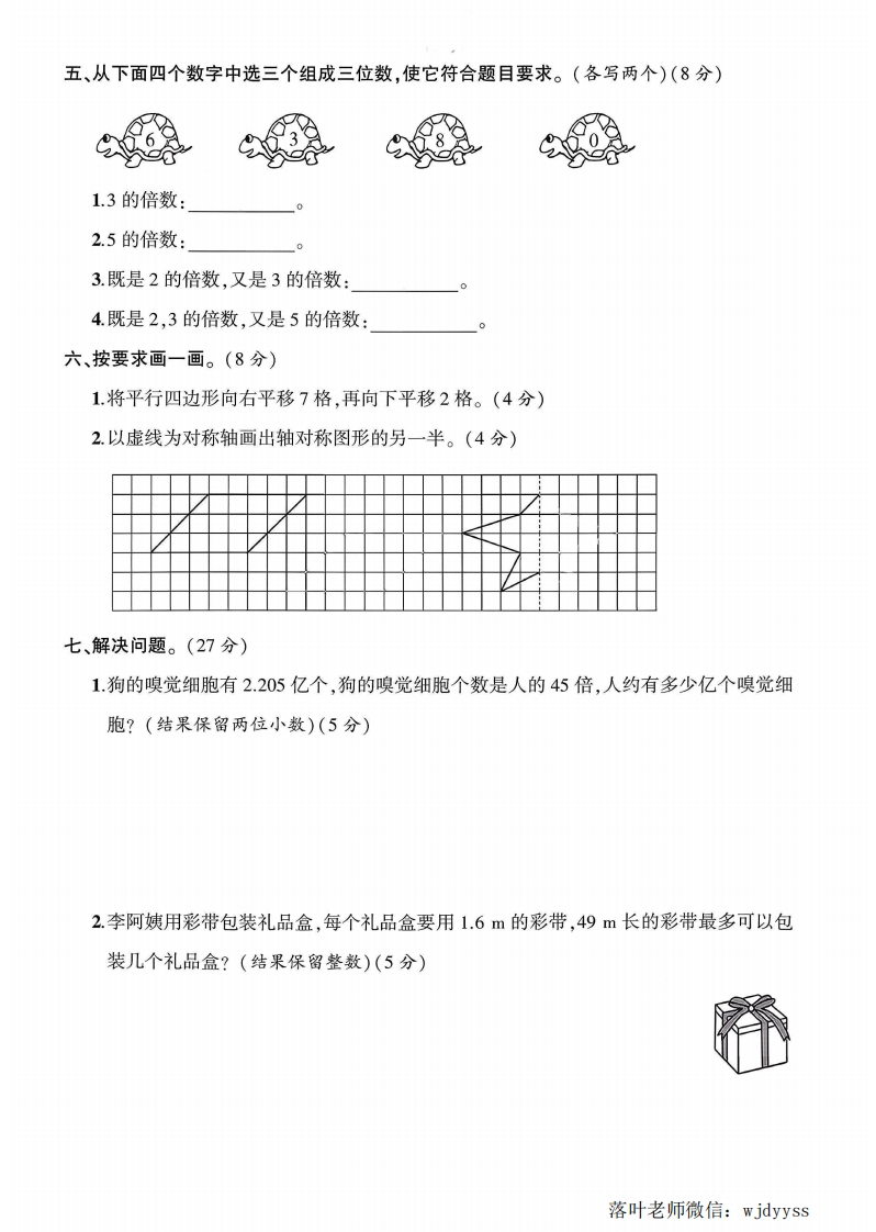 2025北师大版五年级数学上册期中测试卷期中测试卷检测时间:90分钟满分:100分+10分题序三四五六七附加题总分得分一、填空。(每空1分,共21分)1.两个因数的积是0.48,其中一个因数是1.6,另一个因数是(弥)o2.931至少加上()就是3的倍数,至少减去()就是5的倍数。3.根据896÷32=28,直接写出下面算式的商。毁封8.96÷2.8=(89.6÷0.32=()4.8÷9的商是一个()小数,简写为(线5看右图,填一填。(1)图①向()平移了()格。内(2)图②向()平移了()格。(3)图③向()平移了()格。童不6.在24,1,10,3,29,78中,最小的偶数是(),最小的质数是(),既含有因数2,又含有因数3的数是()a要7.两个质数的和是13,积是22,这两个质数是()和()。8.两个小数的商是两位小数,商保留一位小数后是1.5,商最大是(),最小是答(),它们相差()。二、判断。(对的画“V”,错的画“X”)(5分)荞题1.47.8除以一个小数,所得的商一定大于47.8。(2.所有的平面图形都有对称轴。(3.因为4÷0.5=8,所以4是0.5的倍数,0.5是4的因数。()4.1.998精确到百分位约是2。(5.如果a是质数,那么a2一定是合数。(三、选择。(将正确答案前的字母填在括号里)(5分)》☒1.下面的图形是轴对称图形的是()。径Bc落叶老师微信:wjdyyss