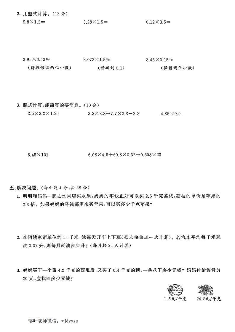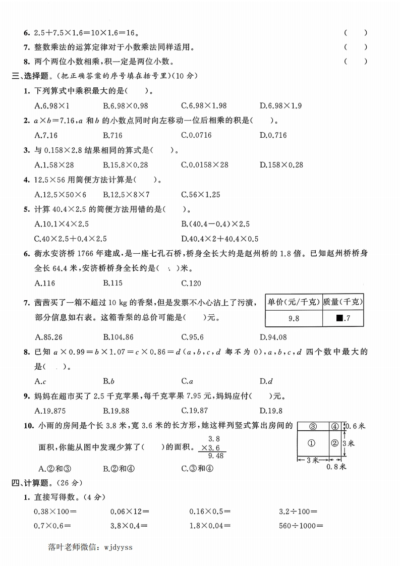 2025冀教版五年级上册数学综合提优测试卷第二单元综合提优卷题号二三四五六总分得分时间:90分钟满分:(100+10)分一、填空题。(第7、12小题各2分,其他每空1分,共28分)1.去掉0.36的小数点,就是把这个数扩大到原来的()倍;把32.4的小数点向左移动两位,就是把它缩小到原来的().密2.0.96千克=()克5升80毫升=()升如2.15时=()分860千克=()吨3.计算3.25×1.4时,把3.25看作(),把1.4看作(),由此算出的积扩大到原来的()倍,所以这个积必须缩小到它的(),才能得到3.25X1.4的积。4.1.37×2.4的积是()位小数,保留两位小数是(5.根据321×23=7383直接写出下面各题的积。3.21×23=(3.21×2.3=(3.21×0.23=(6.一个两位小数用“四舍五人”法保留一位小数是34,这个数最大是(),最小是()。7.2.5x0.73x0.4=☐×☐×0.733.8×0.46+6.2×0.46=(□+□×0.468.在(○里填上“>”“<”或“=”。线3.28×1.01()3.287.41×0.87○7.413.56×135.6÷109.每千克青椒的价格是3.6元,王阿姨买了1.5千克背椒,应付()元。10.王明骑自行车每小时行驶11.8千米,0.5小时可以行驶()千米,1.2小时可行驶)千米。11.天然气是一种洁净环保的绿色能源,张明家10月份用天然气18立方米,每立方米的费用是2.75元,张明家十月份的天然气费用是()元。12.两个因数的积是323.7,如果使这两个因数的积变为3.237,其中一个因数不变,另一个因数应金()。二、判断题。(对的画“√”,错的画“X”)(8分)1.列竖式计算小数乘法时,积的小数点和因数的小数点要对齐。(2.0.25×4×8×0.125=(0.25×4)+(0.125×8)。()3.小数乘整数,积一定是小数。()4.24.9×4.28和2.49×42.8的积是相等的。(5.-个数(不为0)乘001,等于把这个数缩小到它的落叶老师微信:wjdyyss