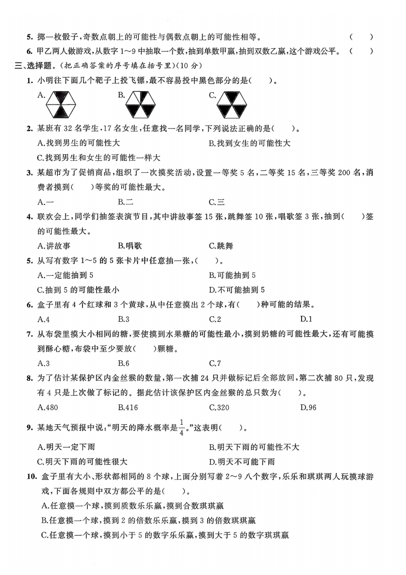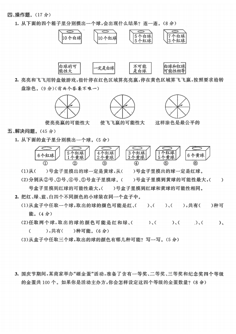 2025冀教版五年级上册数学综合提优测试卷第四单元综合提优卷题号二三四五六总分得分时间:90分钟满分:(100+10)分一、填空题。(每空1分,共22分)1.用“一定”“可能”或“不可能”填空。(1)今天是星期一,明天()是星期二。(2)儿子的体重()比父亲的体重轻。密(3)袋子里都是黑球,任意摸出一个,()是白球。2.盒子里有6个红球,4个黄球,任意摸出一个,可能是()球,也可能是()球,摸出(球的可能性大,要使摸出两种颜色的球的可能性相等,需要再往盒子里放入()个()球。3.笔袋里有5支黄色彩笔,3支绿色彩笔,2支紫色彩笔。从中任意摸1支,有()种可能的结果;任意摸2支,有()种可能的结果。沙4.从右面的盒子里任意摸出1个球,可能有()种结果,摸出()球的可能性6个红球大,摸出()球的可能性小。如果再放人1个白球,摸出一个球,可能有4个黄球()种结果,摸出()球的可能性最大,摸出()球的可能性最小。5.如图,圆盘被分成红色、黄色、蓝色三块区域,指针停在()色区域的可能性最蓝大,指针停在()色区域的可能性最小。红6.右面是李强同学摸球游戏记录(共摸了20次,每学红球正一6次摸出一个球再放回)。下次再摸,摸出()球绿球正正下14次的可能性大。7.小明和小强玩跳棋,选择一种游戏规则决定谁先走棋。下面是几种游戏规则,哪种游戏规则公平?在后面的括号里填上“公平”或“不公平”。(1)可以用“石头、剪子、布”,谁赢,谁先走棋。(2)可以掷骰子,大于3点,小明先走棋;小于4点,小强先走棋。(3)可以掷一块橡皮,平放时小明先走棋,竖放时小强先走棋。二、判断题。(对的画“√”,错的画“X”)(6分)1.石家庄市冬天的气温可能低于0℃。2.一个盒子里装有质地和大小完全相同的2个红球、1个黄球和1个蓝球,任意摸出一个球,摸到三种颜色球的可能性一样大。(3.从一副扑克牌中任意抽取一张,抽到红桃的可能性与抽到黑桃的可能性相等。(4.盒子里有质地、形状、大小完全相同的红色、黄色、绿色、蓝色的珠子各5颗,如果摸40次(每次摸后放回),那么一定会有10次摸出绿色珠子。()