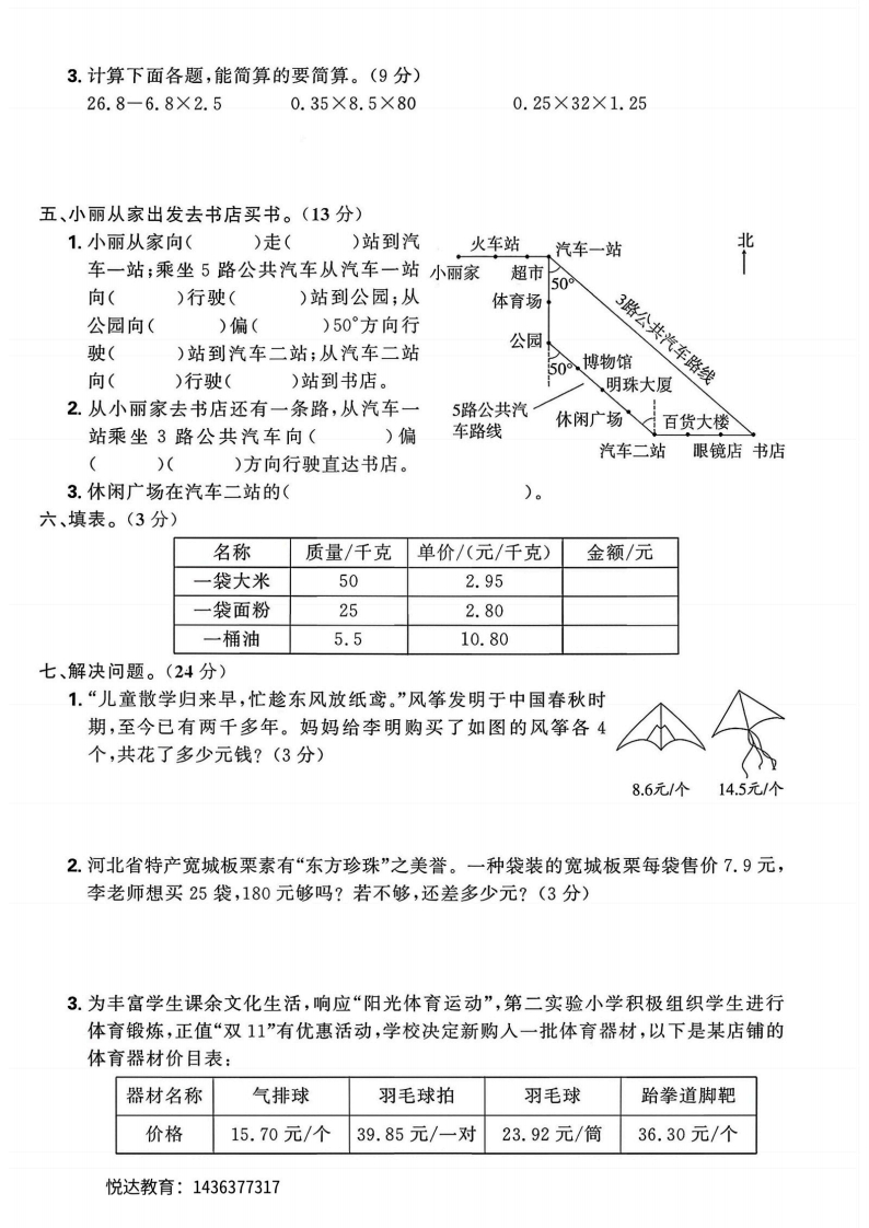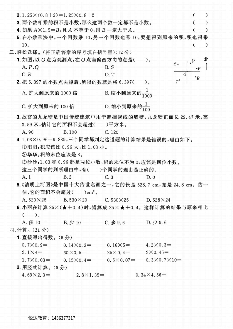 2025-2026学年冀教版五年级上册数学月考真题卷第一阶段核心素养测评卷(月考一)O时间:60分钟义满分:100分题号三四五六七总分等级得分on一、小小填空、奥秘多。(22分》1.抗战时期,我方八路军三支小分队要摧毁敌人的飞北机场,分别从三个方向秘密向敌机场靠近。他们的(位置分别是:龙山小分队在南偏东60°处;李大刚小60459密分队在北偏东45°处;武工小分队在北偏西60°处。敌机场请标出他们的位置。6092.科学家目前通过太空诱变育种科学研究出了一种辣椒品种一太空椒,质量是普通辣椒的1.7倍,一个普通的辣椒约重0.05千克,一毁个太空椒的质量约是()千克封13.两个因数的积是0.48。如果一个因数不变,另一个因数缩小到原来的0,这时的积是();如果两个因数同时扩大到原来的10倍,这时的积是()。4.一个三位小数四舍五人后约是0.65,这个三位小数最小可能是(),最大可能是()。线5.6.324中数字2在()位上,如果把这个数扩大到原来的100倍,数字2在()位上,如果要使数字2在十位上,应该把这个数()。6.小明买了4个笔记本和2块橡皮,每个笔记本1.45元,每块橡皮0.8元,他一共花了()元。7.在下面的○里填上“>”“<”或“=”。(3分)196×0.8○19635×2.5○351.5×3.5○3.5×1.50.78×1.1○0.786.2×0.99○6.23.67×0.42○3.67荞8.2.5厘米=()分米=()米3千克75克=()千克5.04吨=()吨()千克0.6时=()分9.声音在空气中的传播速度大约是每秒340米,它在传播时,如果遇到障碍物会反射回来而产生回声(障碍物离发声的地方有一定距离)。小明面对远处的山崖喊话,经过2.8秒听到回声,小明与山崖之间的距离是()米。二、我是数学小法官。(对的打“√”,错的打“X”)(5分)品1.整数乘法的交换律、结合律和分配律,对于小数乘法同样适用。悦达教育:1436377317