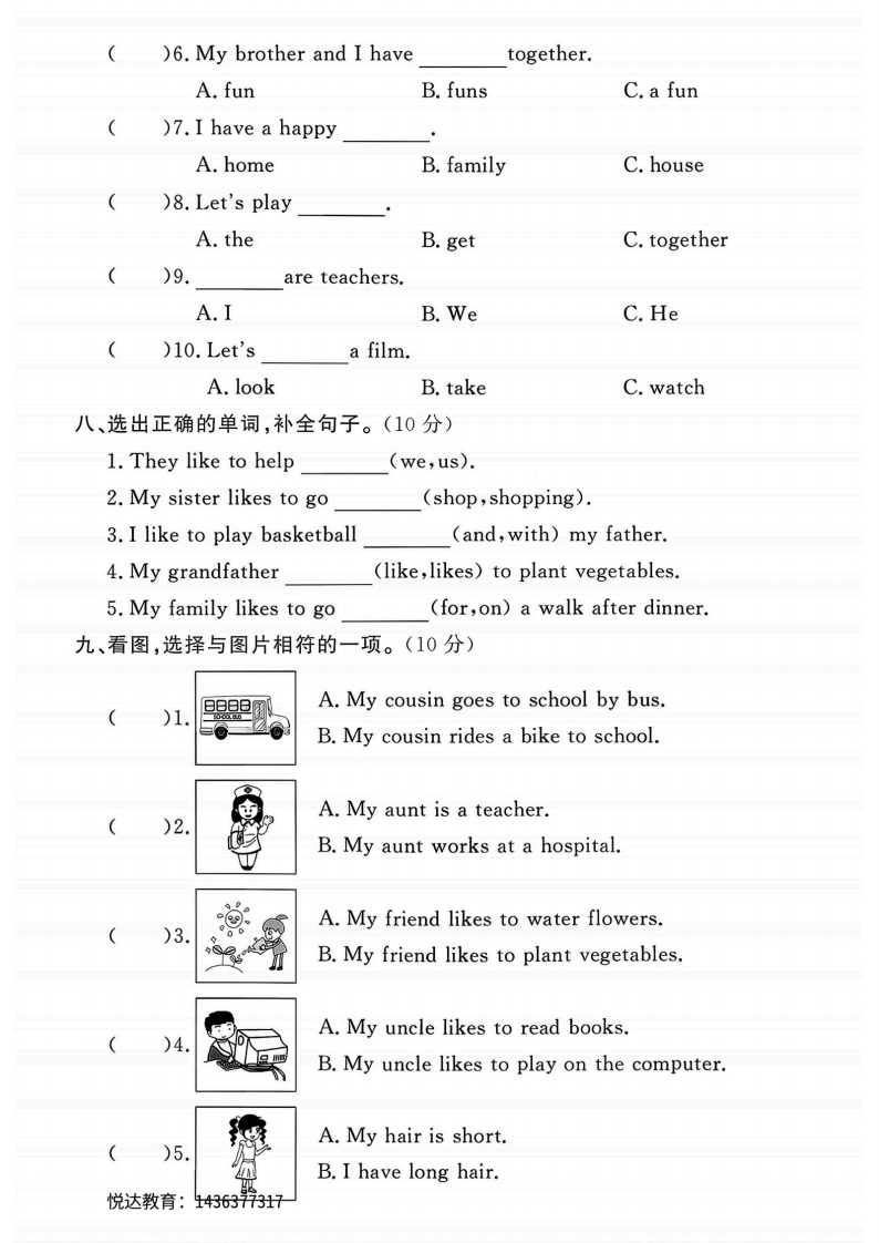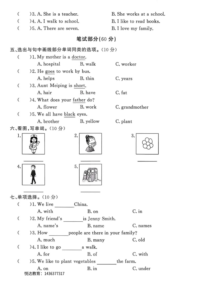 2025-2026学年冀教版五年级上册英语第一次月考卷综合检测卷(月考一)⊙时间:40分钟之满分:100分题号一二三四五六七八九十一总分等级得分听力部分(40分)一、听录音,给图片标号。(10分)白色密细二、听录音,判断句子与所听内容是(T)否(F)相符。(10分)封)1.Bob is my brother()2.Aunt Tina is my father's sister.()3.Jing has a big family.()4.My mother likes to cook.)5.David drives to work.线三、听录音,选择正确答案。(10分)警)1.What does yourlike to do?A.fatherB.motherC.family)2.This is my sister.She likes toA.read booksB.go shoppingC.watch TV)3.I like towith my grandmother.A.plant flowers B.listen to music C.fly kites轿()4.My family likes toA.go for a walk B.watch a filmC.plant vegetables)5.My sister likes toA.ride bikesB.sit and cryC.water flowers四、听录音,选择正确的答语。(10分)()1.A.Li Ming's mother is short.B.It's black.()2.A.He is tall and thin.B.He is my uncle.悦达教育:1436377317