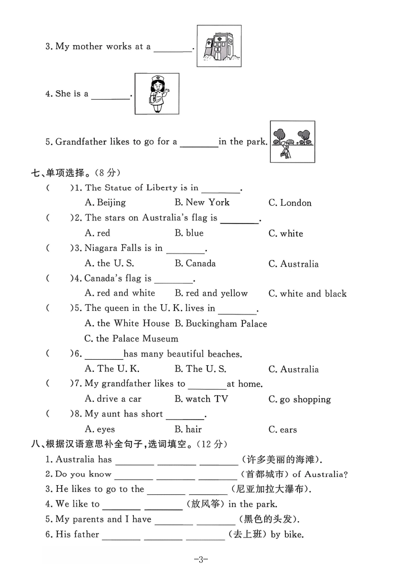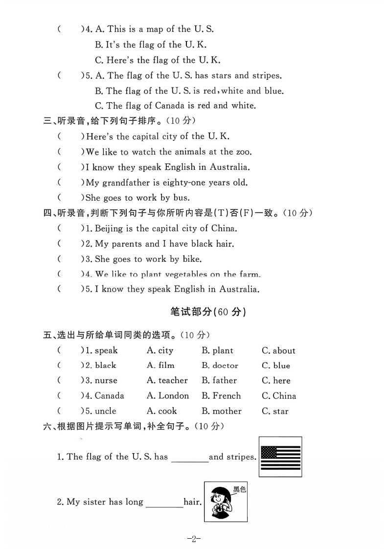 2025-2026学年冀教版五年级上册英语期中检测卷期中检测卷时间:40分钟满分:100分题号二三四五六七九十总分等级得分孙听力部分(40分)一、听录音,选图片。(10分)密)2.★ABAB)3.)4.封团dABAB)5.线AB二、听录音,选出你所听到的句子。(10分)()1.A.I don't have brothers or sisters.B.I have one cousin.C.I have two grandfathers and two grandmothers.荠)2.A.He has white hair.B.She has white hair,tooC.My parents and I have black hair.)3.A.How does she go to work?B.Where does he work?C.How does he go to work?-1-