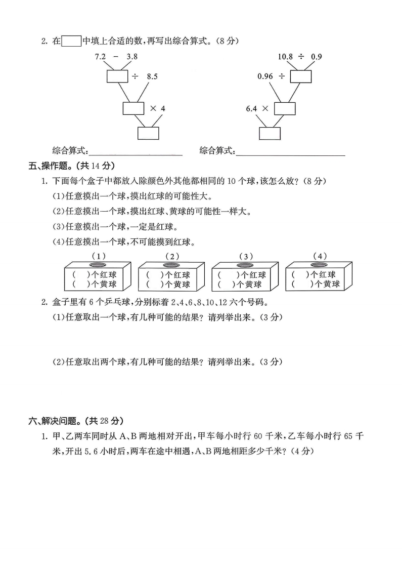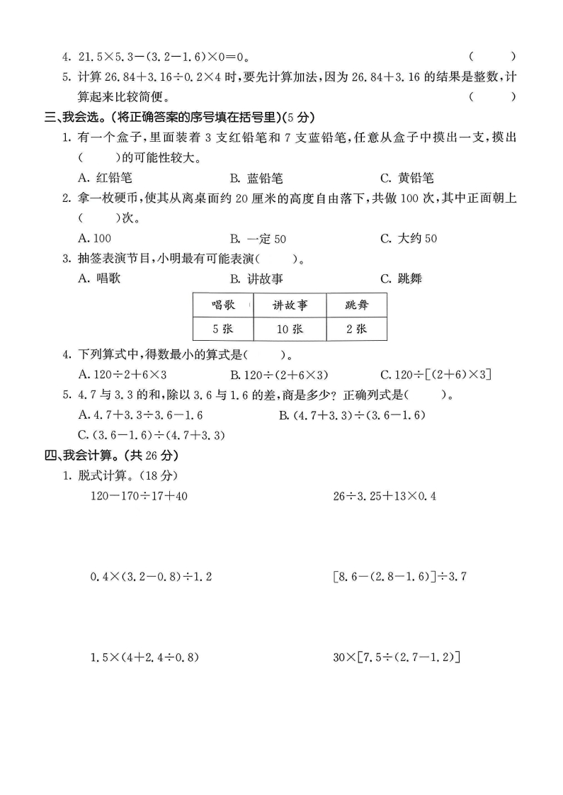 2025冀教版五年级数学上册单元测试卷第四、五单元综合测试卷(时间:90分钟分数:100分)一、我会填。(每空1分,共22分)》1.在一个盒子里放人9个除颜色外都相同的球,其中有6个红球,3个白球。任意从中摸出一个球,可能是(),也可能是(),摸出()的可能性大。2.从一副扑克牌中取出10张红桃,5张黑桃,2张梅花,打乱放在一起。任意抽出一张,有()种可能的结果,最有可能抽到()。3.一个算式里如果既有小括号又有中括号,要先算()里面的,再算()里面的。4.(沧州市河间市)计算[7.5一(2.7十3.8)]÷0.4时,应先算()法,再算(法,最后算()法,结果是()。5.一个正方体有1个面是红色,2个面是白色,3个面是绿色,抛一下看哪一面朝上。可能出现()种结果。出现()的可能性最大。出现()的可能性最小。物6.盒子里有红、黄、蓝三种颜色的玻璃球,每次摸一个,淘气摸了40次,摸球的情况如下表:根据表中的数据推测,盒子里()个数可能最多,()个数可能最少。颜色红球黄球蓝球次数12次25次3次7.信封里有4张卡片,分别写着1、2、3、4四个数字,任意抽出一张卡片,有()种可能结果;任意抽出两张卡片,有()种可能的结果。8.给算式460÷23一19×60加上括号,使它先算减法,最后算除法的算式是(0)。9.袋子里有9个红球,2个黄球,要使摸到的红球和黄球的可能性相等,要加人()个()球。10.豆豆在玩“24点”游戏时,遇到了一组数:2、3、7、10。请你帮豆豆写出综合算式:()。二、我会判断。(对的打“√”,错的打“×”)(5分)1.一枚硬币,抛掷两次,一定是正面朝上一次,反面朝上一次。2.从一副扑克牌中找出4张K扣在桌子上,任意翻开1张,有4种可能结果。紧3.盒子里有100个黄色乒乓球和1个白色乒乓球。任意摸出一个乒乓球,不可能是白色乒乓球。