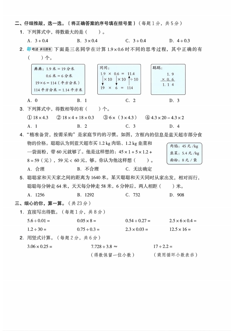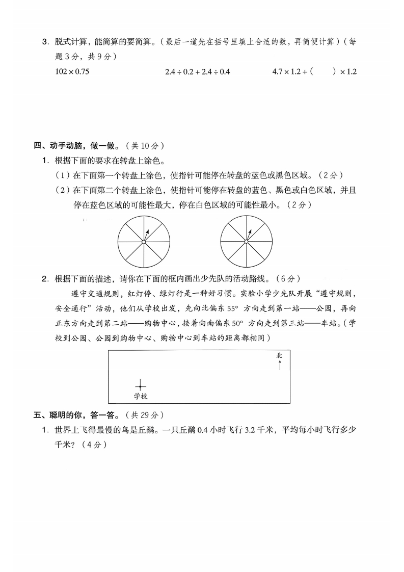 2025冀教版五年级数学上册期中测试卷期中测试卷时间:70分钟满分:100分+10分好一、认真审题,填一填。(每空1分,共33分)1.将小数3.8的小数点向左移动两位后是(),这个数缩小到了原来的()。2.1.28×0.9的积是()位小数;4.18÷2.4的商的最高位是()位。3.[保定市]根据算式25×37=925,可知2.5×0.37=(),92.5÷37=(的欧()×()=9.25。4.0.65平方米=()平方分米56米=()千米1.6小时=()小时()分钟1吨50千克=()吨5.把1.2×20+24.5÷0.5的运算顺序改为先算加法,再算除法,最后算乘法,那么原式应变为(),改后的算式的结果是(誉6.在○里填上“>”“<”或“=”。7.8○7.809.2÷1.01○9.232.5×10(32.5÷0.15.34○5.35.62×0.5○5.62÷0.54.9÷1.54.9÷1.17.新情境趣味数学天天和他的同学们在排练童话剧《皇帝的新装》,皇帝1人出演的角色(如右表)由抽签决定。天天最有可能扮演(大臣6人扮演()的可能性最小。骗子2人8.妈妈要将新榨的12.5kg雪梨汁分装在玻璃瓶中,每个玻璃瓶中最多装0.8kg。这些雪梨汁最多可以装满()个这样的玻璃瓶。如果要将这些雪梨汁分装完,那么妈妈國至少要准备()个这样的玻璃瓶。茶·汽车站北9.如图,某路公交车从汽车站出发,先向()方向行驶公园2站到达银行,再向()偏()()。方向银行学校60060行驶()站到达火车站,最后向()方向行驶体育馆医院火车站动物园2站到达动物园。10.某市规定每户市民每月用水不超过10吨(含10吨),每吨水收费1.8元;超过10吨但不超过20吨(含20吨),超出部分按每吨2.5元收费;超过20吨,超出部分按每吨3.5元收费。华华家上月用水27吨,应缴水费()元;典典家上月缴了40.5元水费,用水()吨。