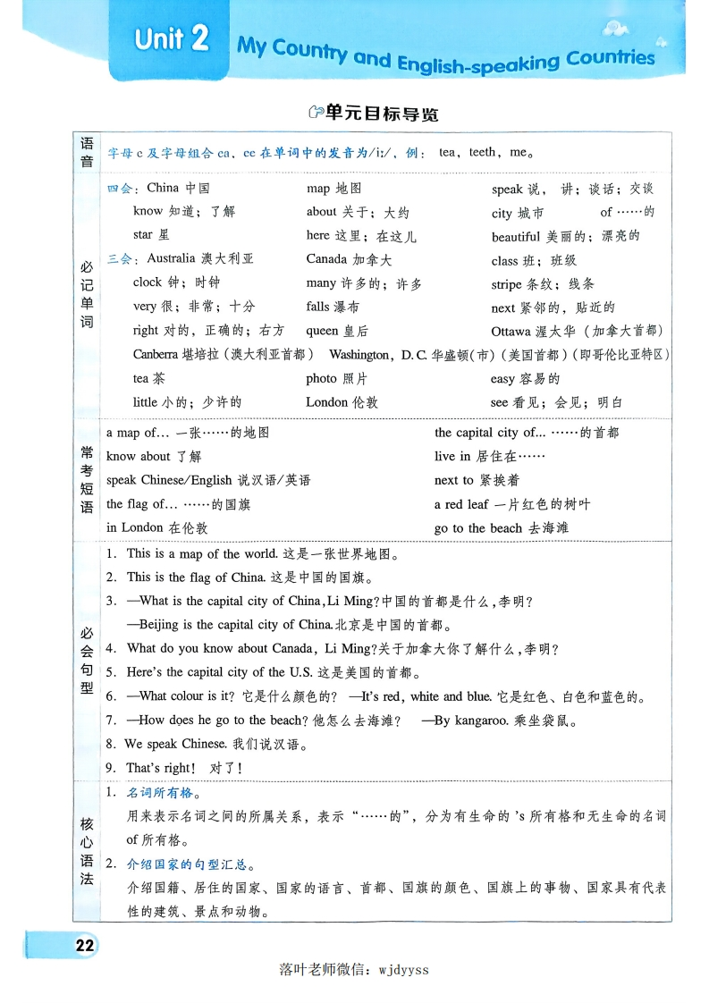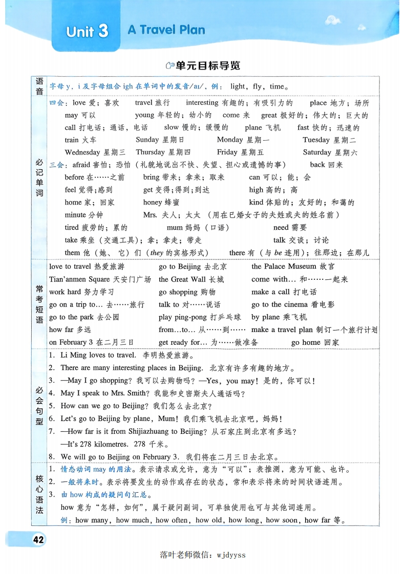Unit 1My Family宁单元目标导览语音字母a及字母组合ay,ai在单词中的发音/c/,例:day,rain,name.四会:father父亲;爸爸mother母亲:妈妈grandfather(外)祖父grandmother(外)祖母have有;吃;进行(活动)(第三人称单数形式为has)brother哥哥;弟弟sister姐姐;妹妹parent父亲;母亲hite白色;白色的hair头发black黑色;黑色的uncle伯父;叔父;舅父;姑父;姨父aunt姑母;姨母;伯母;婶母;舅母cousin堂兄(弟、姐、妹);表兄(弟、姐、妹)thin瘦的必work工作doctor医生hospital医院nurse护士worker工人walk散步;步行;走plant种植flower花;花朵单cook烹调;厨师we我们family家,家庭;亲属flm电影;影片词三会:all所有(的);一切(的)for为…;关于him他(he的宾格形式)boy男孩child小孩;儿童girl女孩sit坐cy哭;(大声)叫喊happy幸福的;高兴的house房屋;房子dinner晚餐;正餐help帮助;协助;援助lesson课;一堂课me我(I的宾格形式)or或者;还是water给…浇水;水again再;又1ook看;瞧stoy故事computer电脑time时间eye眼睛jump跳who谁常live in居住在look like看起来像tall and thin又高又腹walk to work步行上班by bus乘公共汽车go for a walk散步have fun玩得开心on the farm在农场短water flowers浇花go shopping去购物read books读书watch TV看电视语watch a film看电影at the zoo/cinema在动物园/电影院plant flowers/vegetables种花/种莱l.This is my father,my mother and me.这是我的爸爸、妈妈和我。2.Idon't have brothers or sisters.我没有兄弟姐妹。必3.What do they look like?他们是什么样子的呢?会4.—What does your father do?你的爸爸是做什么的?一My father is a teacher.我的爸爸是一名老师。型5.一What does he like to do?他喜欢做什么?-My grandfather likes to go for a walk,我的爷爷喜欢去散步。6.How does he go to work?他怎么去上班?He goes to work by bus.他乘公共汽车去上班。核1.含有实义动词的一般现在时:心表示经常性或习惯性的动作或存在的状态,句型结构:主语+实义动词+其他语2.由what引导的疑问句汇总:what意为“什么”,可用来询问姓名、某物是什么、喜爱的颜色、某人喜欢做的事情、某人的职业、外貌特征等。落叶老师微信:wjdyyss