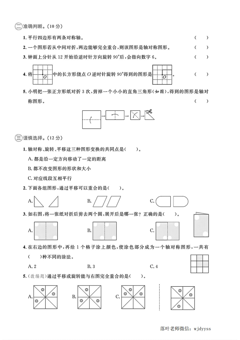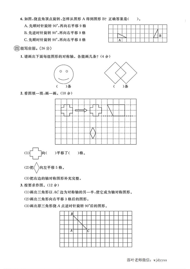 2025青岛63制五年级数学上册单元测试卷第二单元测试卷密⊙测试时间:60分钟⊙满分:100分+卷面:5分评价毁⊙仔细填空。(21分)1.(滨州市沾化区)圆有()条对称轴,大写字母F有()条对称轴,等边三角形有()条对称轴,正方形有()条对称轴。2.如图,点A和点A'到对称轴的距离都是()格,点B和点B到对称轴的距离都是()格,说明轴对称图形的两个对称点到对称轴的距离()。B蠻3.(新角度)图1中,作图形A的()图形可以得到整个图形:图2中,将基本图形)可以得到整个图形。(填“平移”或“轴对称”)封场复⑤图1图24.(聊城市冠县)下图中①号三角形绕A点按()时针方向旋转了()°;②号梯形绕B点按()时针方向旋转了()°。器B5.下图中图①向()平移了()格;图②@向()平移了()格;图③向()平移了()格。舞线6.(☆)如图,盘秤上已有()kg的苹果,再加入()kg的苹果,可以使指针顺时针旋转90°。落叶老师微信:wjdyyss
