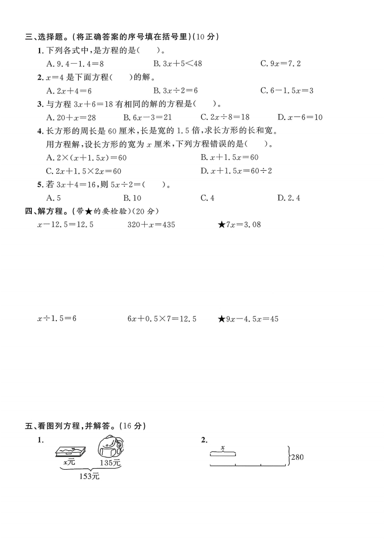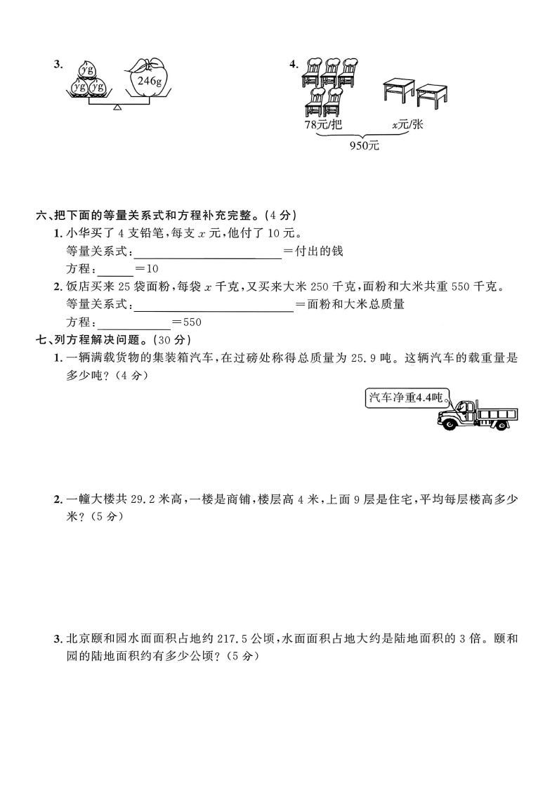 2025青岛63制五年级数学上册第四单元测试卷第四单元测试卷(检测时间:90分钟满分:100十10分)罪题序三四五六七附加题总分得分一、填空题。(第1题4分,其余每空1分,共15分)】1.在(○里填上运算符号,在里填上合适的数。密(1)x-25=32(2)12x=96x-25○32○毁封12xC☐=96Ct=t-线(3)1.4+x=2.3(4)x÷12=0.41.4+x○=2.3x÷12×=0.4×内x=x=2.在4十6x、12+6=18、6a一a=12中,属于方程的是(),它的解是童不()。3.在x=8.5和x=19.9中,()是方程x+5.7=14.2的解。要4.根据条件写出相等的数量关系。(1)科技小组和美术小组一共有45人。((2)白兔的数量是灰兔的3倍。(答(3)杨树比柳树的2倍还多15棵。(5.小明买了6本书,每本b元,付给收银员20元,应找回()元。第寇6.五年级男生人,女生人数是男生的1.2倍,则五年级共有()人,女生比男生多()人。7.一张桌子售价为145元,比一把椅子售价的3倍少8元,设一把椅子售价为x,所列方程为()。8.如果3x+1.8=1.8,那么x÷2.9=()。二、判断题。(对的打“/”,错的打“×”)(5分)1.0.85x=12既是等式又是方程。☒2.方程的解就是解方程。(3.x的5倍与5个x的和是5,列方程是5x+5x=5。()径4.若5a÷6=9,则5a=9×6。5.如果6x一12=24,那么12x-3x=54。