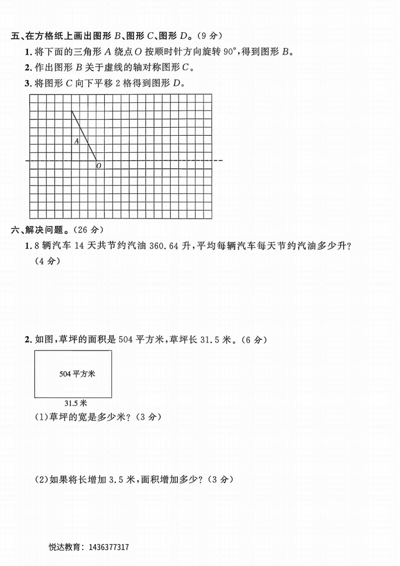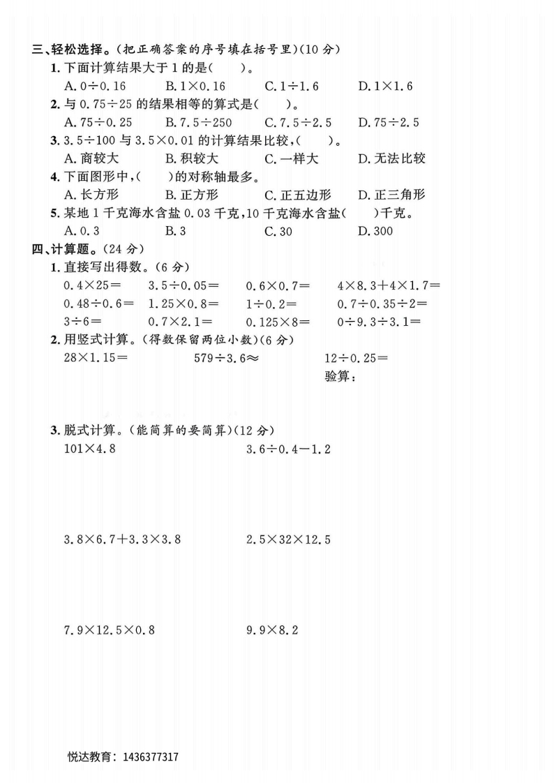 2025-2026学年青岛版五年级上册数学月考真题卷第一阶段核心素养测评卷(月考一)可时间:60分钟之满分:100分题号三四五六总分等级得分一、小小填空,奥秘多。(21分)孤1.4.8十4.8+4.8+4.8+4.8=()×(2.正方形有()条对称轴,长方形有()条对称轴,正三角形有密()条对称轴。3.某工厂正加急赶制一批防护服,已知每件防护服需要0.9千克无纺布,该工厂筹备的1吨无纺布最多可以生产()件防护服,生产的防护服每5件装成一箱,至少需要()个箱子。封4.0.16×54的积有()位小数;64×0.245的积有()位小数。5.一个三位小数的近似值是2.50,这个数最大是(),最小是(6.把0.505、0.5、0.505、0.505按从小到大的顺序排列起来。()。7.五(1)班28人乘车去郊游,一共缴费968.8元,平均每人缴费()元。线8.在括号里填上“>”“<”或“=”。48.5÷16()48.532.4÷0.45()32.45.6×0.14()0.141.8X2.9()1.87.26÷1()7.260.25×3.6()3.69.王师傅加工一种零件,5分钟加工了20个,那么王师傅平均加工1个零件需要()分钟,平均1分钟能加工这种零件()个。二、我是数学小法官。(对的打“/”,错的打“X”)(10分)1.一个数除以一个比1的小数,商一定大于原数。2.无限小数一定是循环小数。(3.一个小数的近似值一定小于原来这个小数。(4.图形在旋转和平移时,形状和大小都不发生变化。(5.用竖式计算小数乘法时,应把因数中的小数点对齐。(悦达教育:1436377317