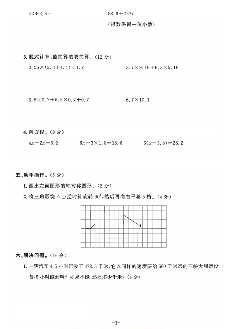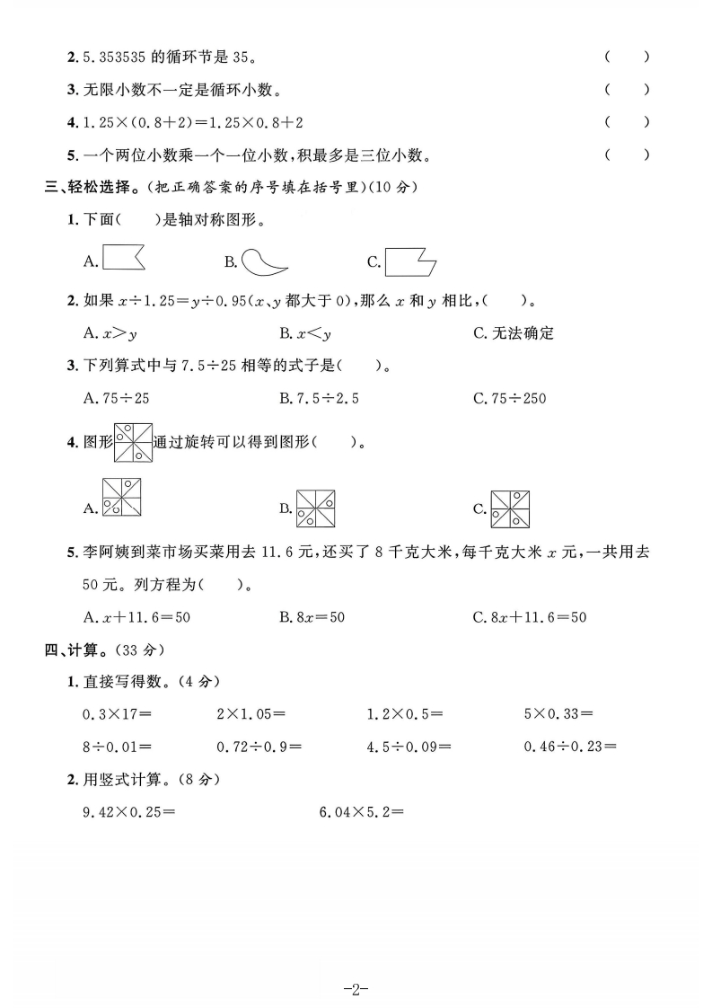 2025-2026学年青岛版五年级上册数学期中测评卷期中综合素养测评卷时间:60分钟满分:100分题号三四五六总分等级得分一、小小填空,奥秘多。(25分)鄂1.34.5×0.27的积是()位小数,76.14÷1.8的商的最高位在()位上。2.0.9×25.5的积有()位小数,结果保留一位小数是();3.16×0.8的结密果精确到百分位是()。3.22.4÷11的商是一个()小数,用简便方法记做(),保留三位小数是()。毁封4.7.6÷0.45=()÷45=7600÷(5.在(○厘填上“>”“<”或“=”。4.25×1(4.251.2×0.9(0.09×120.35÷0.8线○0.355.7÷1.035.75.3×0.6○5.3÷0.699×2.6○2.6×100-2.66.将0.6、0.60、0.606、0.06按从小到大的顺序排列。)<()<()<(!7.把一个小数的小数点向右移动一位后,得到的数比原数大9.9,原数是(8.当x=()时,4十x=10,当x=()时,2x-1=15。豁9.算式29.5÷0.77可以转化成2950÷77来计算,依据是(10.甲数的3倍等于乙数的5倍,已知甲数是6.6,乙数是(二、我是数学小法官。(对的打“√”,错的打“×”)(10分)左图一共有4条对称轴。-1-