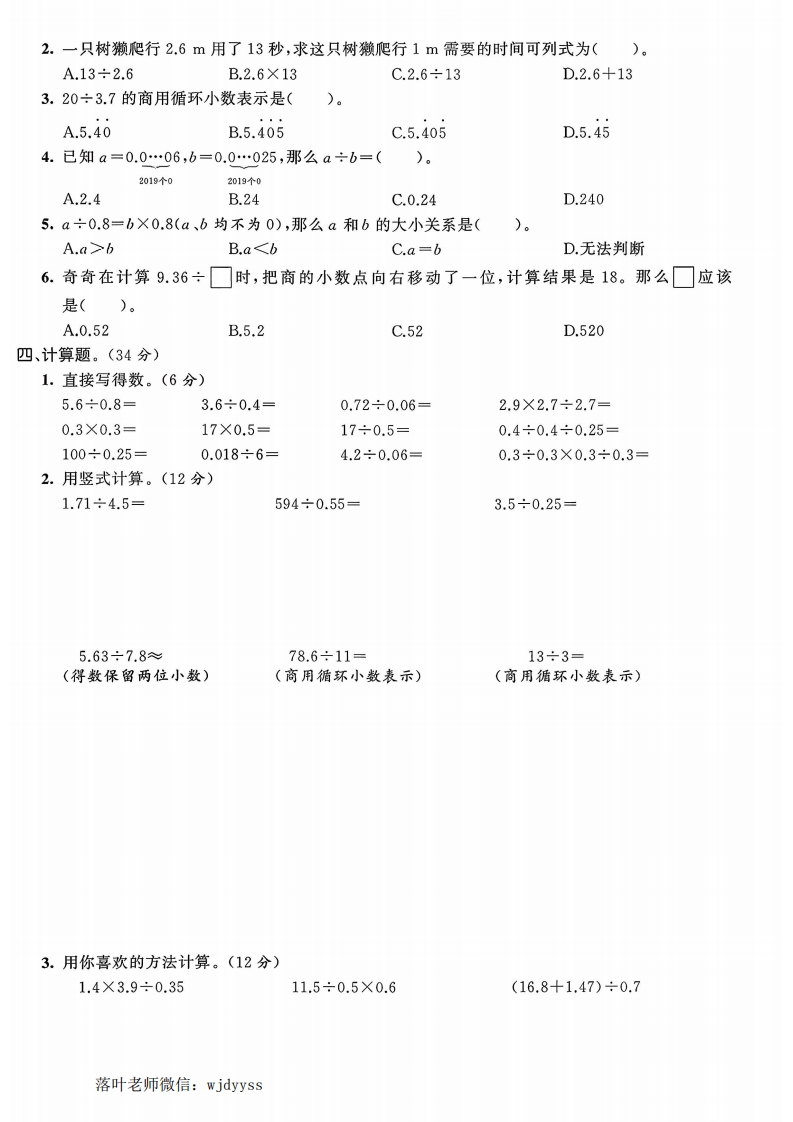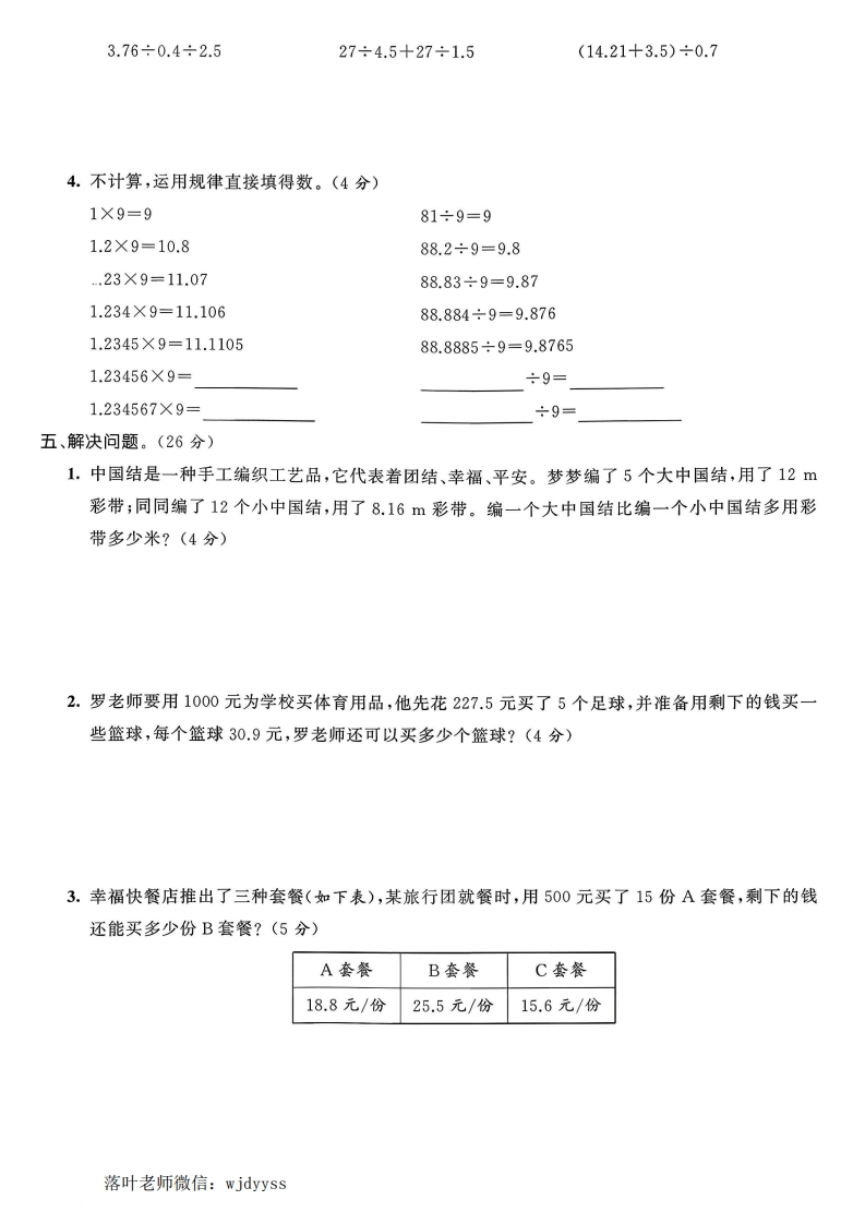 2025人教版五年级上册数学综合提优测试卷第三单元综合提优卷题号四五六总分得分时间:70分钟满分:(100+10)分一、填空题。(每空1分,共28分)1.计算0.38÷0.076时,要先把被除数和除数的小数点同时向()移动()位,变成(()再计算,运用的是()的性质。2.根据912÷38=24,直接写出下面各式的商。9.12÷38=()91.2÷3.8=()0.912÷0.24=()如製3.小亮在计算一道除法题时,把除数0.25看成了2.5,结果得数是0.16,正确的结果是()。4.9÷3.7=2.432432…小数后第15个数字是(),第35个数字是(5.在○里填上“>”“<”或“=”。1.73÷1.7092.46÷2.473.54÷0.993.54封4.67÷1.034.6786.4÷108.644.2×0.994.26.两数相除的商是6.5,如果被除数扩大到原来的10倍,除数缩小到原来的,商是()。7.瑞安陶山红糖闻名浙南,120kg的甘蔗可制作15kg的红糖,按照这样计算,1kg甘蔗能制作厨r)kg的红糖;1kg的红糖需要甘蔗()kg。8.一个油桶最多可装5.5kg汽油,至少用()个这样的油桶才能装下40kg汽油。线9.把5.761、5.761、5.76、5.76按从大到小的顺序排列。()>()>()>()10.轩轩在计算一道除法题时,误将被除数3.6看成了6.3,结果得到的商比正确结果大3,则正确的结果是()11.已知(△+☆)÷1.5=0.96,1.8×☆=0.81,则△=(),☆=()。二、判断题。(对的画“√”,错的画“X”)(6分)显1.74÷13的商的最高位是个位。(2.一个数除以0.1,等于这个数乘10。(3.0.060606是循环小数。(4.320÷1.25×8=320÷(1.25×8)=320÷10=32。(5.在a÷b=5.4中,如果a不变,b除以9,那么商是0.6。(6.0.5÷0.3=5÷3=1…2。(三、选择题。(把正确答案的序号填在括号里)(6分)1.如果x表示大于0的数,那么在下面的算式中,商最小的是()。A.x÷0.7B.x÷1.2C.x÷0.01D.x÷10.02落叶老师微信:wjdyyss