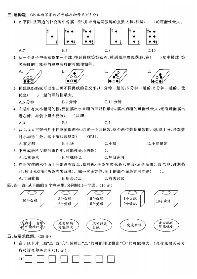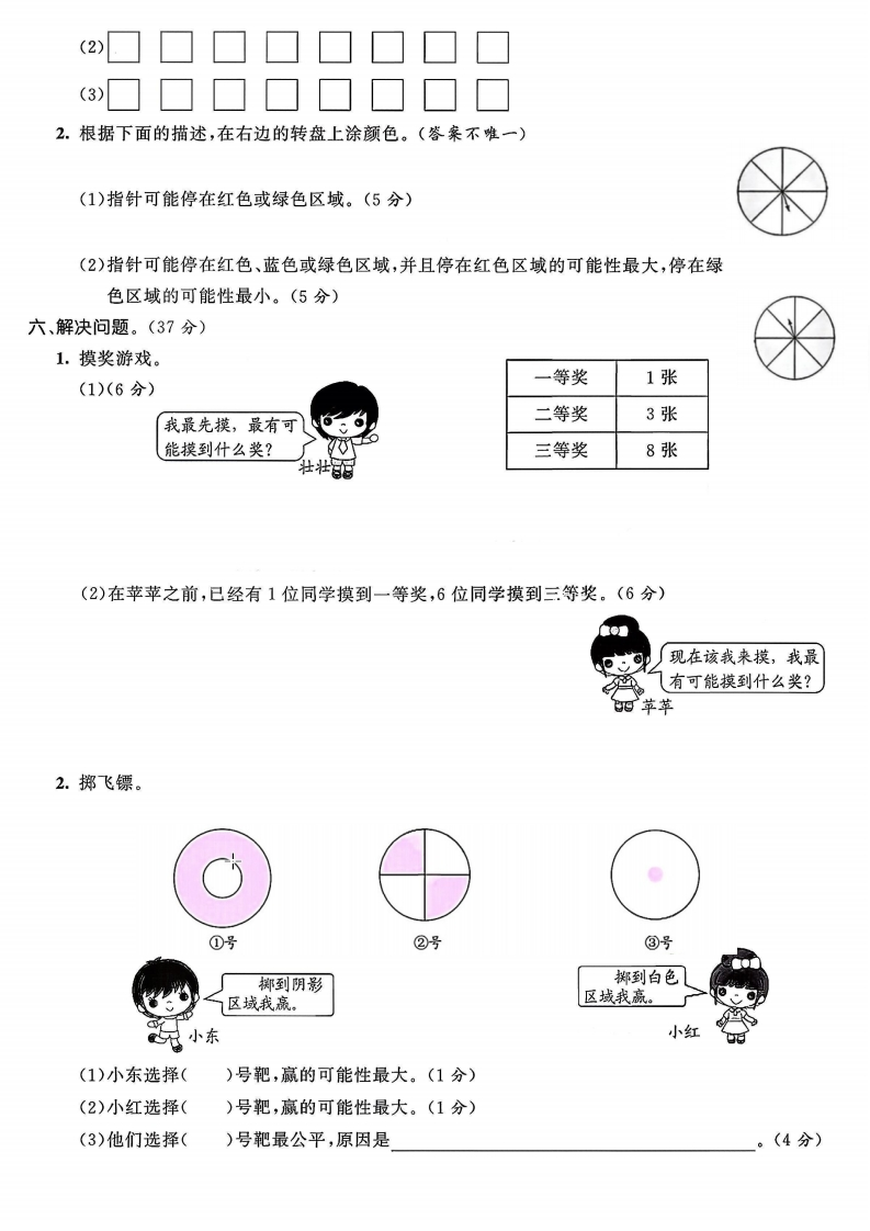 2025人教版五年级上册数学单元综合提优测试卷第四单元综合提优卷题号二三四五六七总分得分时间:70分钟满分:(100+10)分一、想一想,判一判。(8分)一定不可能X可能O我从出生到现在没吃一,点儿如东西。地球每天太阳从西都在转动。三天后下雨。边升起。多2妈妈比我小袋鼠有爸爸。鱼儿生活在水中青青会追上明明年龄小。二、填空题。(每空1分,共13分)1.一个正方体的各个面上分别写着1,2,2,4,4,4。掷一次有()种可能出现的结果。2.今天是星期二,今天之后第10天()是星期五。(填“可能”“不可能”或“一定”)线3.在一家百货商店购物超过100元的顾客,店主奖励抽奖券1张,用这张券可奖元0元以转动圆盘1次,如右图。顾客转动圆盘1次有()种可能。可能性最大0元0元的是(),可能性最小的是()。0元4.盘子里放着3个苹果,5个橘子,2个桃子,7个梨,小明随便拿出一个水果,10元0元有()种可能,拿到()的可能性最小,要想让这种水果的可能性最大,至少还要加()个。5.如图,阴影都分占这个圆的号,空白部分占这个圆的弓.转动转盘,指针落在()部分的可能性大。6.甲、乙、丙、丁四位工人每小时加工的零件个数如下。甲乙丙丁3个5个4个6个加工120个零件,任意指派一位工人,在40小时内()(填“一定能”“可能”或“不可能”)完成,在30小时内完成的可能性较()(填“大”或“小”)。