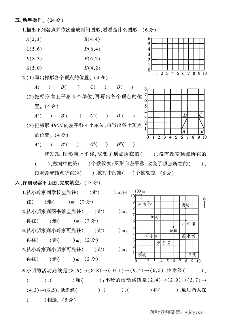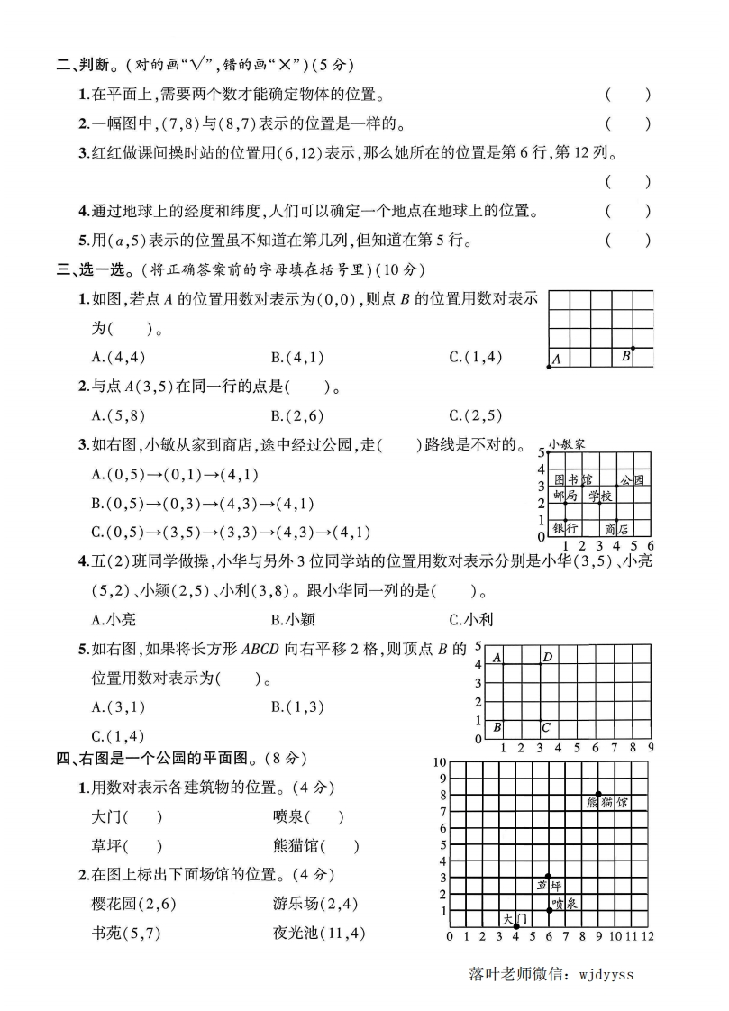2025人教版五年级数学上册单元测试卷第二单元测试卷检测时间:90分钟满分:100分+10分题序二三四五六七附加题总分得分一、填一填。(每空1分,共24分)》弥1.列队时,我们通常把()叫行,()叫列,确定第几行,一般从()往)数;确定第几列,一般从()往()数。封2.电影票上“2排5号”记作(),“7排10号”记作(),()表示()排()号。籤3.桐桐在班里是第二列第三行的同学,品晶在他后面3行,亮亮坐在他左边1列。如果线桐桐的位置用()表示,那么晶晶的位置是(),亮亮的位置是()。4.看右图填空。内(1)小明的位置表示为();冬冬的位置表示3为();小丽的位置表示为()。薰不(2)马亮的位置在(),在图中圈出马亮。小明(3)小明右边的第二个同学的位置表示为(要右边的第一个同学的位置表示为(5.下面是露露的玩具柜。答6②,③钢的位置用者⑤数对表示是(3,2)。(1)放在同一列的是()和(),放在同一行的是()和()。(填序号)(2)老的位置用数对表示是();的位置用数对表示是()o(3)小欣想把⑧放在用数对表示是(1,1)的位置上。在图中用“(○”表示出来。6.如果点A用数对表示为(1,5),点B用数对表示为(1,1),点C用数对表示为(3,1),e那么三角形ABC一定是()三角形。落叶老师微信:wjdyyss