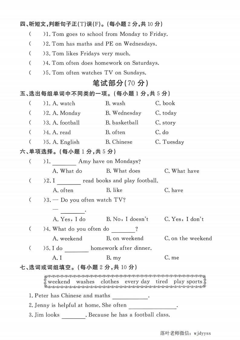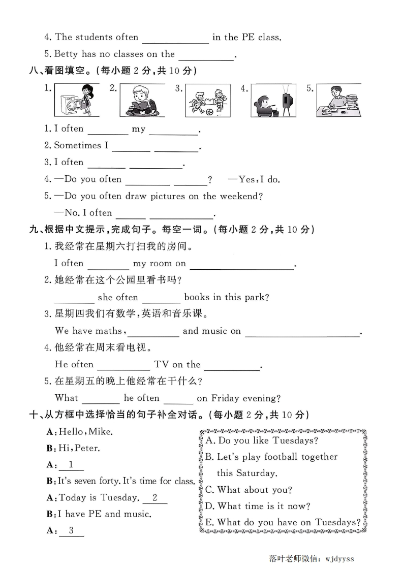 2025人教版五年级英语上册单元测试卷第二单元测试卷霈检测时间:60分钟满分:100分题序三四五六七八九十十二总分得分听力部分(30分)弥一、听录音,选出你听到的图片。(每小题1分,共5分)扫码听听力毁封)1.)2.AB线Weuceounin97星期四星期二内()3()4.AB蕾不)5.B要二、听录音,根据所听到的内容连线。(每小题1分,共5分)1.JohnA.play football答2.AmyB.read books靠3.OliverC.wash clothes题4.Zhang PengD.watch TV5.MikeE.do homework三、听录音,用1~5的序号给下列句子排序。(每空2分,共10分)()Miss Hu.()Great!What do you have on Mondays?☒)I love art.Who's your art teacher?()I have maths,English and art.栏)Grandma!Look at my new storybooks.落叶老师微信:wjdyyss