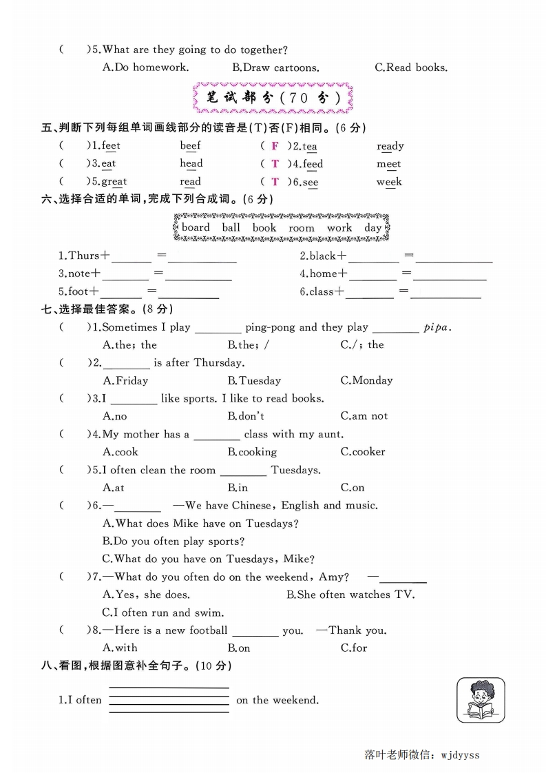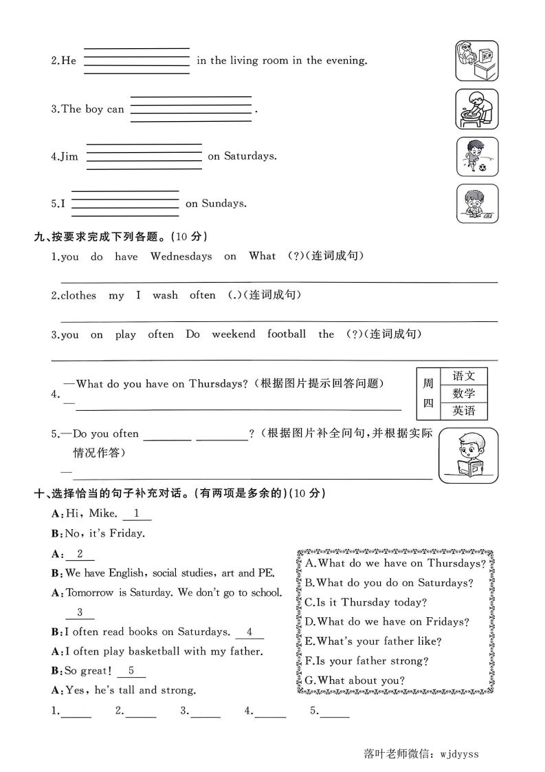 2025人教版五年级英语上册单元测试卷第二单元测试卷时间:60分钟满分:100分题序三四五六七八九十十一十二总分n得分听力部兮(30兮、美典典晓弥一、听句子,选出你所听到的单词。(5分)()1.A.MondayB.WednesdayC.Friday封()2.A.scienceB.mathsC.music第()3.A.dayB.todayC.Thursday()4.A.SaturdayB.TuesdayC.Sunday线()5.A.readB.watchC.wash二、听句子,用1~5的序号给下列图片排序。(5分)》内T必不((三、听问句,选择正确的答语。(10分】)1.A.Yes,I am.B.No,I don't.要()2.A.Mr Wang.B.He's very kind.1()3.A.I like Chinese and English.B.We have Chinese,English and music.答)4.A.I play sports every day.B.She plays ping-pong every day.)5.A.Yes,it is.B.Today is Friday.毁!四、听五段对话,根据对话内容选择正确的答案。(10分)题()1.What day is it today?A.Tuesday.B.Wednesday.C.Thursday.()2.What does Sarah often do on Saturdays?A.She often reads books.B.She often washes her clothes.C.She often watches TV.☒()3.Does Eric often play football on the weekend?A.Yes,he does.B.No,he doesn't.C.No,he does.)4.What do they have on Mondays?A.English and PE.B.English and computer.C.English and art.落叶老师微信:wjdyyss