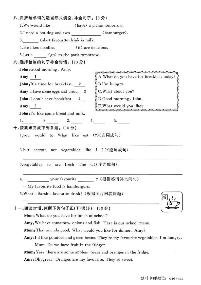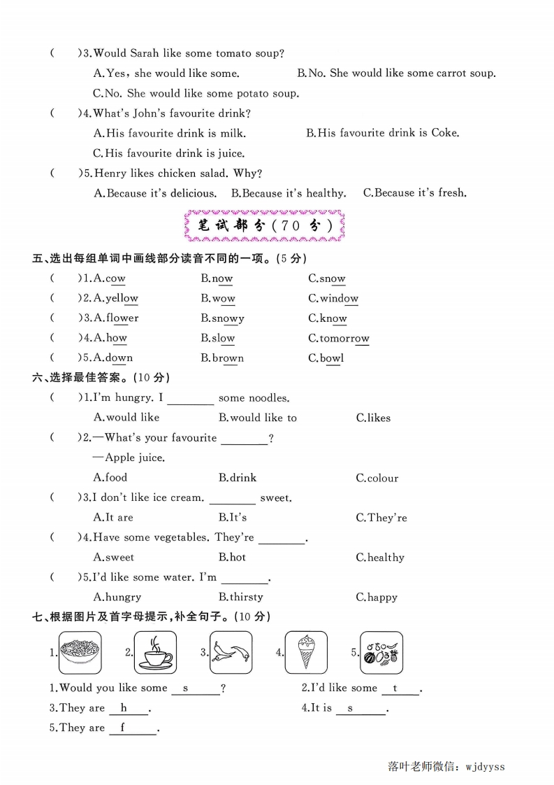 2025人教版五年级英语上册单元测试卷第三单元测试卷时间:60分钟满分:100分:题序三四五六七八九十一十二总分咖得分:听力部分(30分)5水类兆地类类类米类米光%%类地弥一、听句子,选出你所听到的单词。(5分)()1.A.freshB.foodC.favourite码听听力1封()2.A.hamburgerB.hungryC.healthy靠()3.A.sweetB.saladC.sandwich()4.A.hotB.happyC.thirsty线)5.A.waterB.sweetC.would二、听录音,用1~5的序号给下列图片排序。(5分)内量不三、听问句,选择正确的答语。(10分)】()1.A.I'd like some milk.B.We have art and PE.要C.I often watch TV on Saturdays.)2.A.Yes,I have fish.B.No,we have rice.答C.I like beef,but I'm hungry now.)3.A.I have noodles for breakfast.B.Noodles.拟C.I have hamburgers for breakfast.题()4.A.I have some grapes.B.I'd like a sandwich.C.I like bread.()5.A.Yes,it is.B.Yes,I am.C.Yes,we do.四、听录音,根据对话选择正确的答案。(10分))1.What would Mike like to eat?A.He would like some ice cream.B.He would like some salad.西C.He would like some sandwiches.柜)2.What would Amy like to drink?A.She would like milk.B.She would like some water.C.She would like some juice.落叶老师微信:wjdyyss