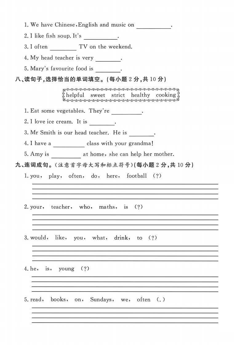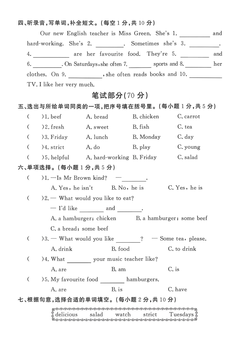 2025人教版五年级英语上册期中测试卷期中测试卷器检测时间:60分钟满分:100分题序三四五六七八九十十一十二总分得分听力部分(30分)弥一、听录音,选出你听到的单词。(每小题1分,共5分)扫妈听听力()1.A.oldB.politeC.hot毁封()2.A.funnyB.happyC.sunny()3.A.freshB.foodC.tall线()4.A.youngB.youC.your)5.A.TuesdayB.ThursdayC.Saturday内二、听录音,用1~5的序号给下列图片排序。(每空1分,共5分)螢不要三、听录音,根据所听问句选择恰当的答语。(每小题2分,共10分))1.A.Ms Wu.B.She is kind.答C.Yes,she is.靠)2.A.I'd like a sandwich.B.I'd like some tea.题C.I like sandwiches.)3.A.Yes,I do.B.Yes,she does.C.Yes,he does.)4.A.I have PE,English and Chinese.B.No,I don't.C.I often read books.时)5.A.Ice cream.It's sweet.B.Tea.It's healthy.eC.Apples.They're fresh.