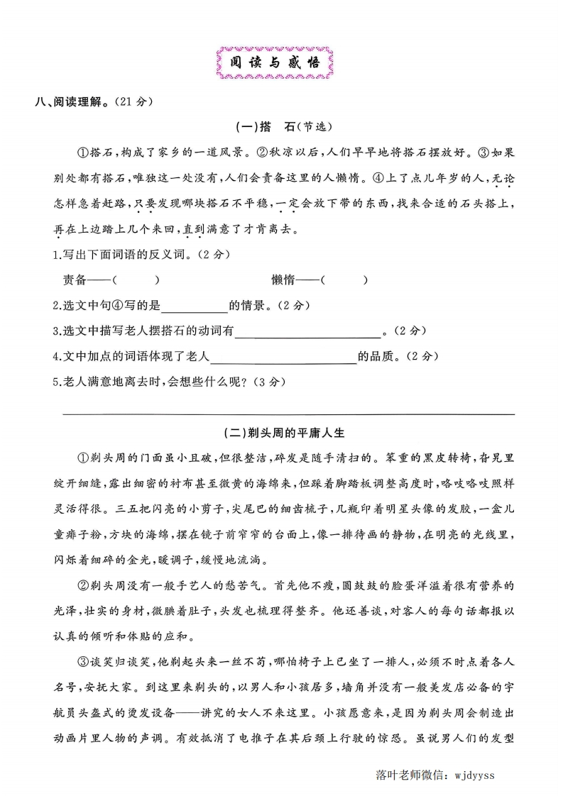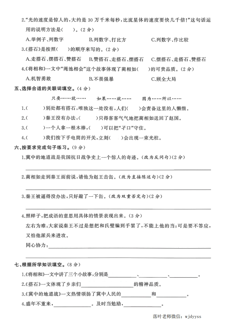 2025人教版五年级语文上册单元测试卷第二单元测试卷时间:90分钟满分:100分题序三四五六七八九总分得分基础巩固跳兆%%%弥一、读拼音,写词语。(7分)封1.lan duo和dan gie都会fang ai我们走向成功。2冀中平原上的人民靠着地道这种坚固的bǎ01ěi凭借自己的智慧给敌人线:设下yinb的xiàn jing,同日本gin lue军展内开斗争。二、按查字典的知识填空。(6分)不“绰”用音序查字法,应先查大写字母,再查音节:用部首查字法应先查部,再查画。“绰”在字典里的解释有:①宽裕;②(体态)柔美。“人影要绰绰”的“绰”应选第种解释,“手头阔绰”的“绰”应选第种解释。三、把词语补充完整,并选词填空。(7分)答)()归赵()穷()尽)()请罪()()之宝毁()心()力()口不(不计()()难以()()题1.和氏璧是,秦王非常想得到它。2.只要我们,美丽的“中国梦”就一定会实现。3.为了打击敌人,什么办法都想出来了,人民的智慧真是的。四、选择题。(8分)(3-高)池1.下列加点字的读音有误的一项是()。(2分)A.削弱(xuē)任意(ren)B.平衡(hen)承诺(nud)C.皇冠(guan)岔道(chd)D.谴责(qian)袍子(páo)落叶老师微信:wjdyyss