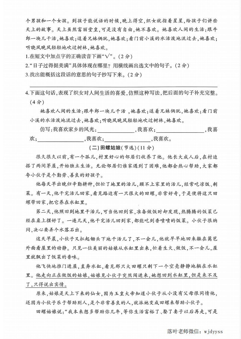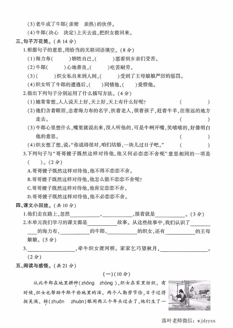 2025人教版五年级语文上册单元测试卷第三单元测试卷器检测时间:90分钟满分:100分题序二三四五六总分得分一、生字熟记。(共15分)弥1.读拼音,写词语。(8分)chou xieding zhǔchiyanbeng ta44毁封jiéhunsheng fànfa0线2.在加点字的正确读音下画“V√”。(3分)内梭子(sho suo)爹娘(d die)监狱(yùyòu))衰老(shuaiai)发誓(shi si)稀罕(han han)不3.比一比,再组词。(4分)谎悔郎要慌侮答二、词语积学用。(共10分)》1.根据意思写成语。(4分)靠题(1)形容情况非常真实。()(2)眉头舒展,眼含笑意。形容高兴愉快的样子。()(3)互相依靠着过日子。泛指互相依靠,谁也离不开谁。)(4)形容自由自在,没有牵挂。(2.下列俗语与成语搭配不恰当的一项是()。(2分)A打破砂锅问到底—追根究底B.鼻子都气歪了—气势汹汹C打开天窗说亮话一直言不讳D前怕狼后怕虎畏首畏尾☒3.根据语境,在合适的词语下画“”。(4分)(1)在我国的一些地区,(流传传说)着一个动人的民间故事。任(2)他正在深山里打猎,忽然听见一群鸟在(批评议论)着什么。落叶老师微信:wjdyyss