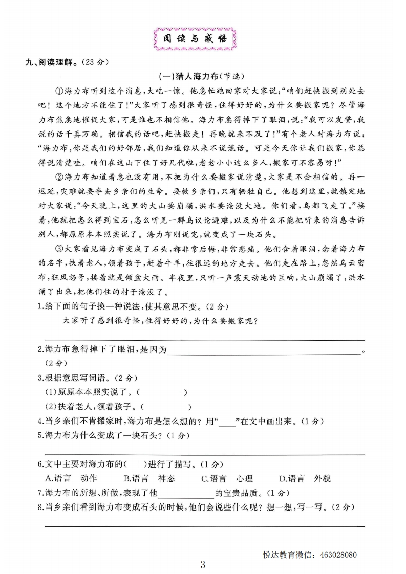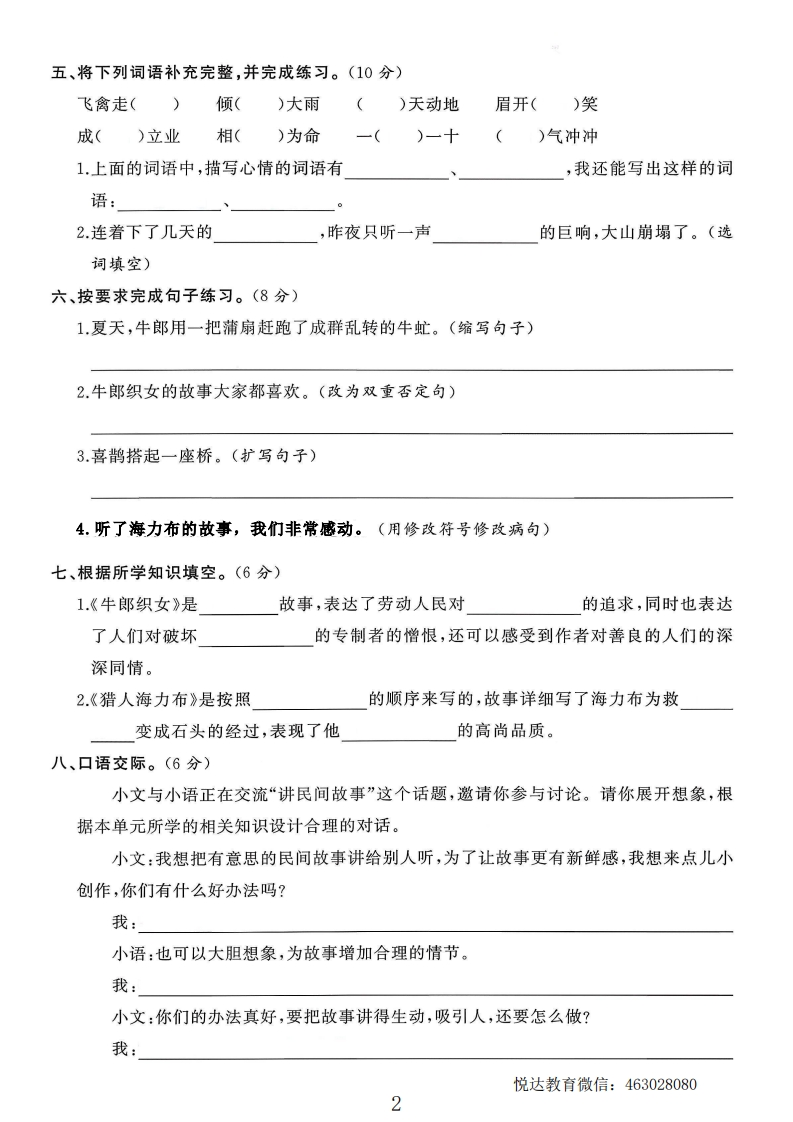 2025人教版五年级语文上册单元测试卷第三单元测试卷时间:90分钟满分:100分题序四五六X八九十总分得分基础巩固弥一、读拼音,写词语。(8分)chou laoyan changzhēnbǎotuofò封fashijiaosaoZihao dai线内二、请用“”画出每组中加点字读音错误的一项,并改正在后面的括号里。(4分)1.梭子(suδ)依偎(wei)珊瑚(shan)牺牲(x)不2.筛子(sdi)结婚(hun)礁石(jiāo)竹筐(kuang)3.堂皇(huang)酿酒(niang)勤恳(kěn)拗不过(you)要4.节俭(jiǎn)瞌睡(kē)衰老(shuai)丢三落四(Iuò)三、选词填空。(3分)等亲密亲热亲切毁1.那头老牛和牛郎很(题2.大伙儿跟久别的家人一样,()极了。3.老师()的话语使我们永远难忘。四、下列句中加点的俗语使用不恰当的一项是()。(2分)A他一向刻苦学习,所以今年能考上理想的大学。这正是种瓜得瓜,种豆得豆。.(B)有)池B屋里太热了,我们还是打开天窗说亮话吧!C.像这样前怕狼后怕虎,我们终将一事无成。D.俗话说得好:吃水不忘挖井人。我们不能忘记那些为国捐躯的烈士们。悦达教育微信:4630280801