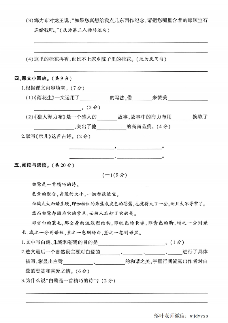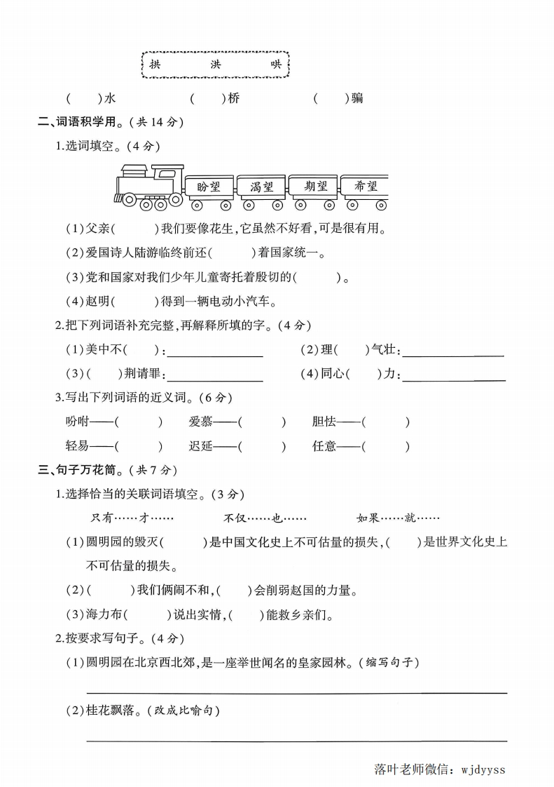 2025人教版五年级语文上册期中测试卷期中测试卷检测时间:90分钟满分:100分题序三三四五六总分得分一、生字熟记。(共20分)弥1.读拼音,写词语。(8分)yùnweijian zhùfangàizhen tian dong di毁封lan duòding zhǔxiaohuijinbihui huang线内2.在加点字的正确读音下画“V”。(3分)》嗜好(hdnhao便宜(pidnbian)挨近(dii)不间隔(jianjian)强逼(giangqiang冠军(guanguan3.下列加点字读音完全正确的一组是()。(3分)要A.镜匣(jiá)石榴(iu)糕饼(bing)B.垂蔓(mdn)平衡(hén)允诺(nuo)答C.酬(ch6u)谢侵(qin)略顷(qing)刻4.选字组词。(6分)靠题筐框眶镜(限(箩()抄炒()闹()写)菜☒悔诲侮教()恨)辱落叶老师微信:wjdyyss