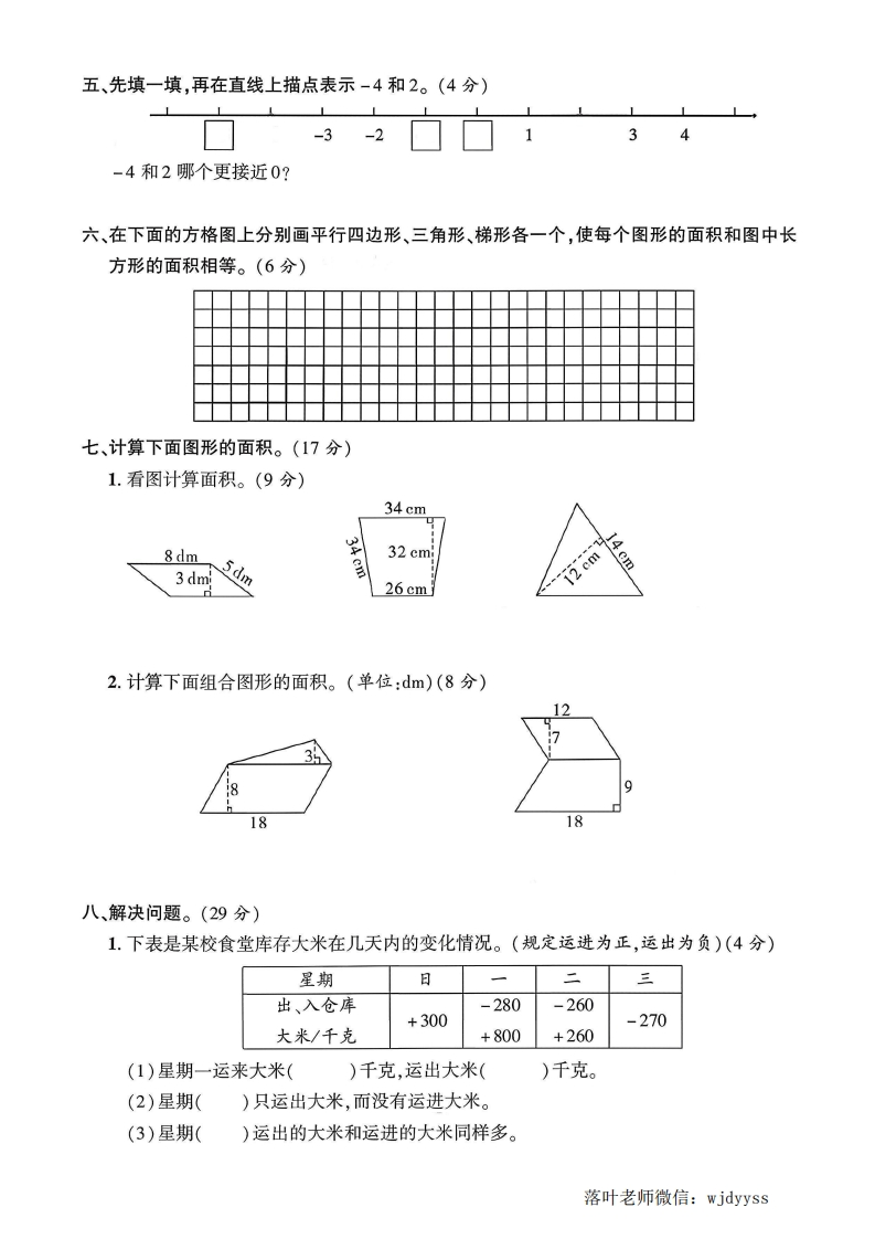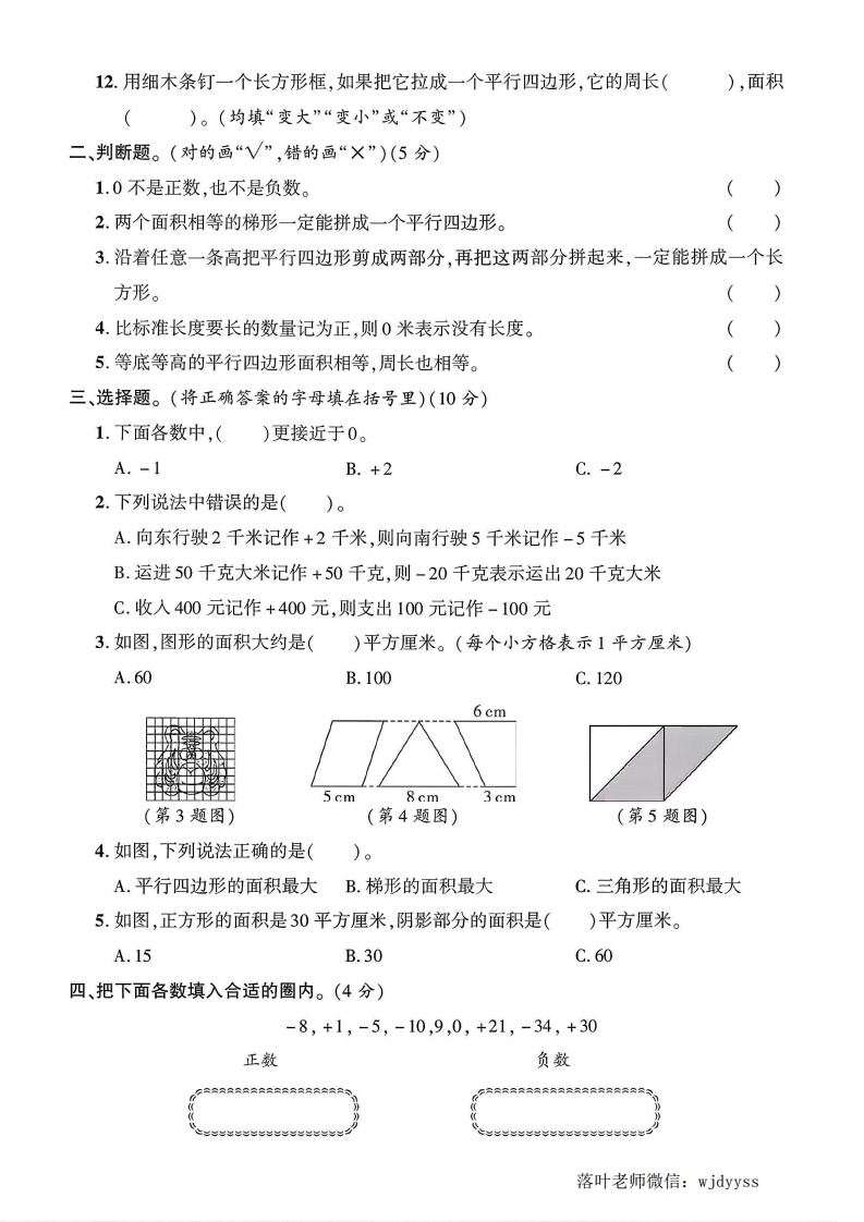 2025苏教版五年级数学上册单元测试卷第1-2单元测试卷器检测时间:90分钟满分:100分+10分题序三四五六七八附加题总分得分一、填空题。(25分)弥1.正五十二写作(),-19读作()。2.如果盈利900元记作+900元,那么亏损300元记作()元;比海拔-100米再灯封低10,可记作()米。3.9平方米=()平方分米30000公顷=()平方千米线250000平方米=()公顷60平方千米=()平方米4.在括号里填上合适的单位。电视机的屏幕面积大约是1580(内)。五(1)班教室的占地面积大约是60()。一片果林的面积大约是2()黨不香港特别行政区的面积大约是1100()。5.饼干包装盒上标有净含量()克的字样,表示这盒饼干的标准质量是()克,要最多不超过()克,最少不少于()克。6.一个三角形的面积是14平方米,与它等底等高的平行四边形的面积是()平方米。答7.梯形的上下底之和是14厘米,高是8厘米,面积是()平方厘米。8.一个三角形的面积是24平方厘米,底是12厘米,它的高是()厘米。靠9.一个占地4公顷的平行四边形鱼池,底是200米,高是()米。题10.下图是一个平行四边形,其中阴影部分三角形的面积是35平方分米,平行四边形的面积是()平方分米。38cm28 cm25 cm-(第10题图)(第11题图)11.如图是一个模型的横截面,上面的三角形底是()厘米,高是()厘米,这个横截面的面积是()平方厘米。落叶老师微信:wjdyyss