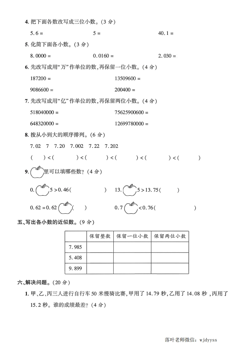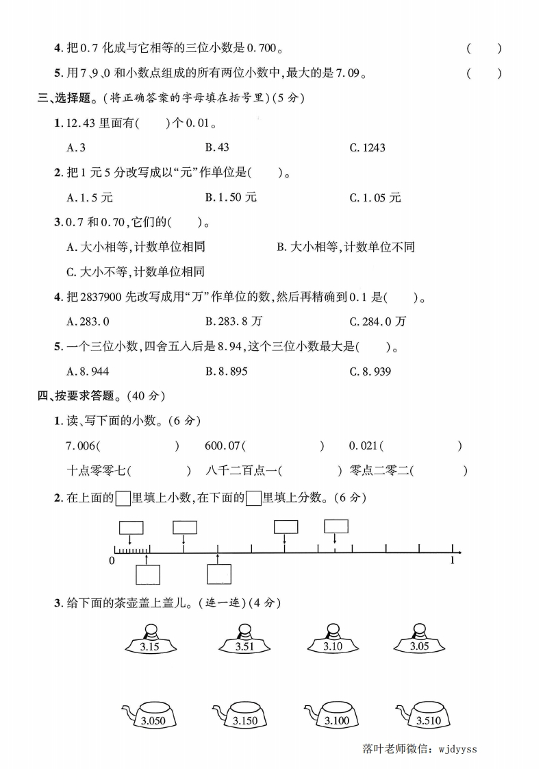 2025苏教版五年级数学上册单元测试卷第三单元测试卷露检测时间:90分钟满分:100分+10分题序二三四五六附加题总分得分一、填空题。(21分)弥1.把下列各图中涂色部分用小数表示出来。毁封线(2.0.7的计数单位是(),它有()个这样的计数单位,再添上()个这样的计内数单位结果等于1。蠻3.7个0.1和9个0.01组成的小数是(不4.7.683中的6在()位上,表示6个();3在()位上,表示3个要()。5.在(○里填上“>”“<”或“=”。答102○101.90.506○0.569○9.003.08○3.80黎题6.在8.899、8.76、8.80、8.9、8.8这几个数中,最大的数是(),最小的数是(),相等的数是()和()。7.4.56>4.☐6,☐里最大能填();9☐8950000≈9亿,☐里最小能填()。8.马小哈在读一个小数时,没有看到小数点,结果读成了二十三万零八,原来的小数要读出两个零,原来的小数是(230.008)。二、判断题。(对的画“V”,错的画“X”)(5分)1.把5改写成计数单位是0.01的数是0.05。(2.在9的末尾无论添上几个0,它的大小都不变。(径3.比0.3大而比0.4小的小数有无数个。(落叶老师微信:wjdyyss