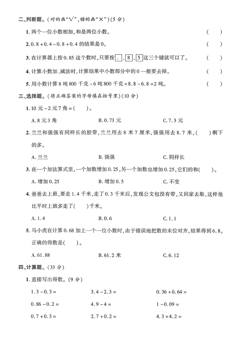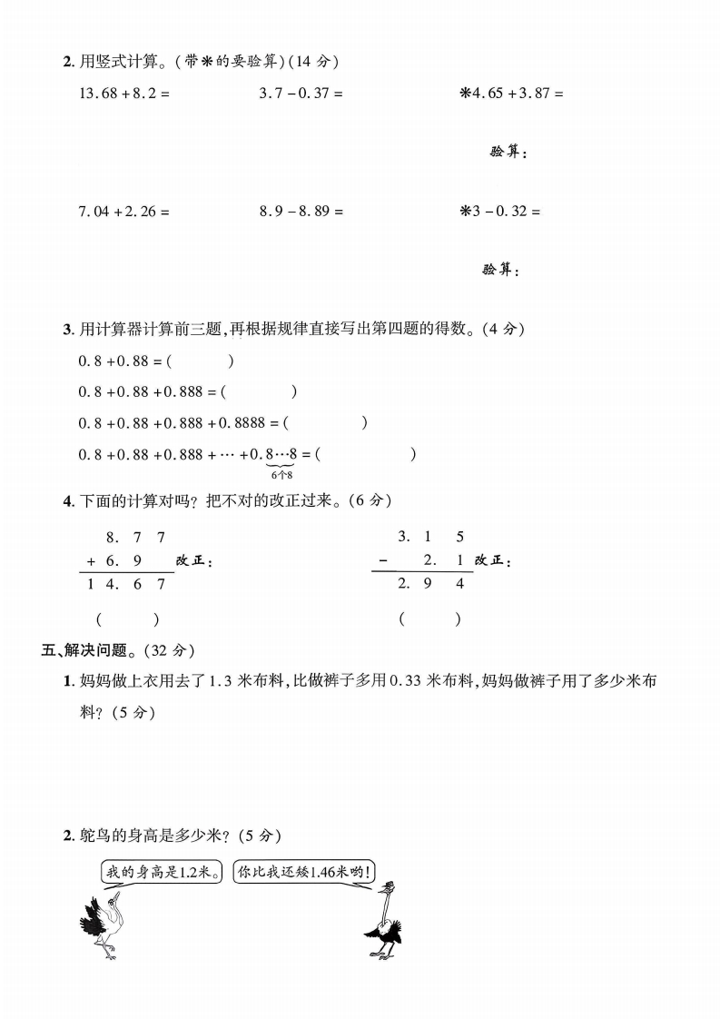 2025苏教版五年级数学上册单元测试卷第四单元测试卷吹检测时间:90分钟满分:100分+10分题序二三四五附加题总分得分一、填空题。(第5题6分,其余每空1分,共20分)弥1.用竖式计算加、减法时,先把各数的()对齐,再按照()加减法的法则进行计算,最后在得数里对齐横线上的小数点,点上小数点。毁封2.比3.92多0.4的数是();比4.93少1.5的数是(线3.3.17+()=11.43()-4.05=44.甲数是3.58,乙数是1.35,两个数的和是(),两个数的差是()内5.在(○里填“>”“<”或“=”。(6分)黛0.5+2○50.77○0.17+0.6不0.56-0.23○0.56-0.326.一个三角形,三条边的长度分别是2.67厘米、5.92厘米、4.5厘米,这个三角形的周长要是()厘米。7.小张、小李、小王三人称体重,小张体重52.6千克,比小李重0.8千克,小李体重答()千克,小王比小张轻2.9千克,小王体重()千克。第恩8.甲、乙两地相距220米,小华和小红同时分别从甲、乙两地出发相对走来,当小华走了85.2米,小红走了70.5米时,两人还相距()米。9.小颖在计算1.5-0.8+2.5时,错算成15-0.8+25,结果比正确结果大(10.根据前三题的得数,直接写出最后一道题的得数。1.2+1.12=2.321.2+1.12+1.112=3.432因1.2+1.12+1.112+1.1112=4.54321.2+1.12+1.112+…+1.1…12=()7个1