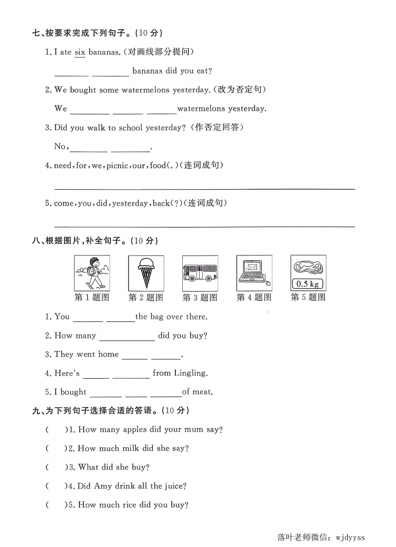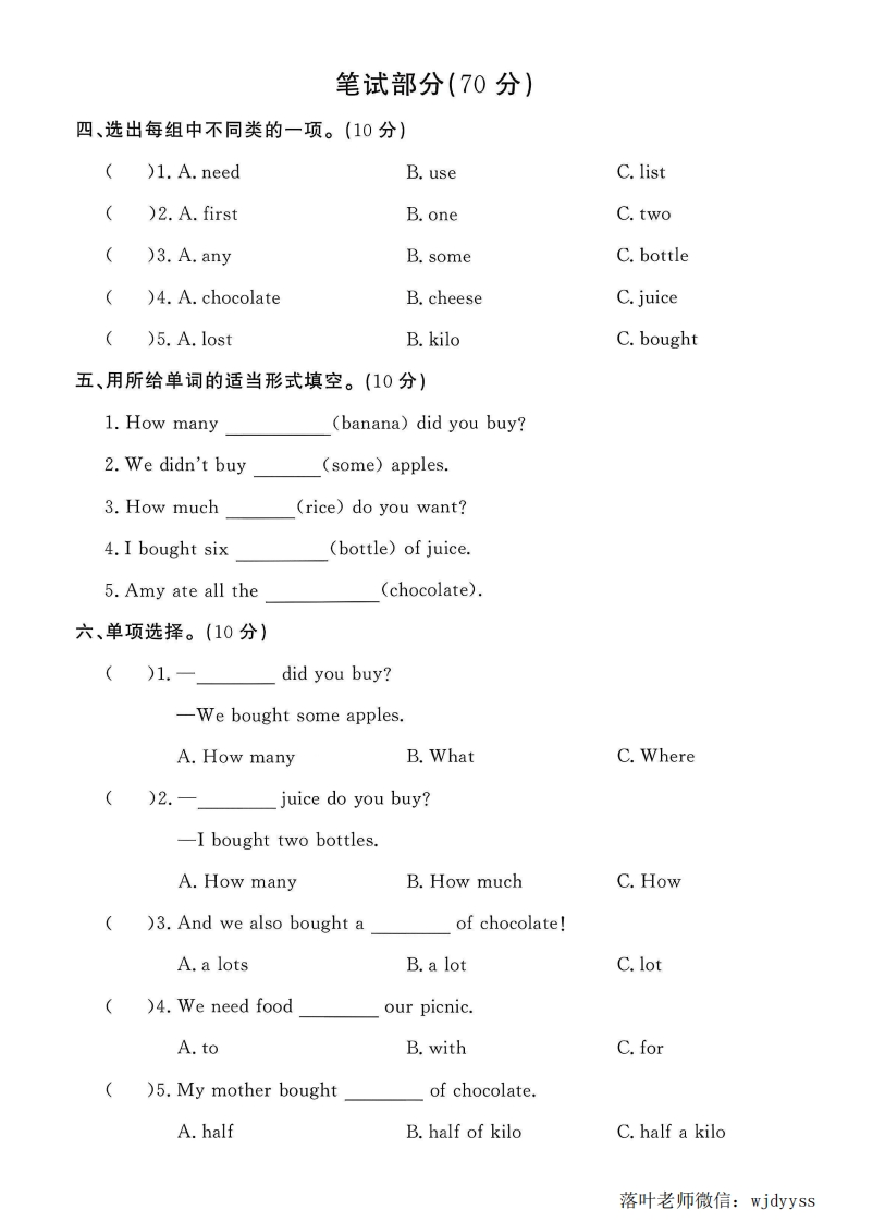 2025外研版五年级英语上册单元测试卷第二单元测试卷霸检测时间:60分钟满分:100分题序二三四五六七八九十总分得分听力部分(30分)密一、听录音,选出你所听到的单词。(10分)】扫码听听力毁封()1.A.manyB.anyC.some)2.A.fiveB,fineC.first线()3.A.canB.can'tC.couldn't内()4.A.buyB.boughtC.box黨不)5.A.lostB.loseC.look二、听录音,为下列图片排序。(10分)要答,题三、听录音,根据所听问句选出合适的答语。(10分)()1.A.Four apples.B.Four bottles.C.I bought apples.()2.A.She ate it all.B.We bought pears.C.I like pears.()3.A.Two bottles.B.Some juice,please.C.Four.()4.A.Yes,she is.B.Yes,she did.C.Yes,she does.()5.A.Two bottles.B.Two.C.Half a kilo.落叶老师微信:wjdyyss